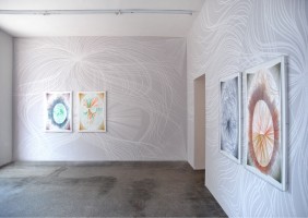 Der Titel der Ausstellung "Sonnenlicht" benennt die vitale Energie die in den Arbeiten steckt und bezieht sich auf die die Waende bedeckende Kreidezeichnung, die mit ihren Strahlen die komplette Galerie ausfuellt. Die Wandzeichnung breitet sich, von den Papierarbeiten ausgehend, wie ein Echo ueber den Raum aus und verwandelt die Galerie in einen obskuren Kultraum. Christliche Assoziationen vermischen sich mit aztekischem Sonnenkult und Kinderbuchillustrationen. Die Quelle der Arbeiten ist schwer zu entschluesseln. Sie reicht von Christusdarstellungen bis zu Hippie Klischees, von baertigen Holzfaellertypen zu Dschingis Khan und Tom Selleck. Beruehmte Charaktere wechseln sich ab mit Figuren die zur privaten oder imaginaeren Sphaere des Kuenstlers gehoeren. In kraftvollen Zeichnungen werden sie unhierarchisch zitiert, vermischt, und mit Liebe zum Detail in einer brillianten chromatischen Synthese veraendert |