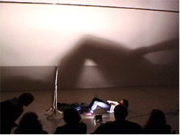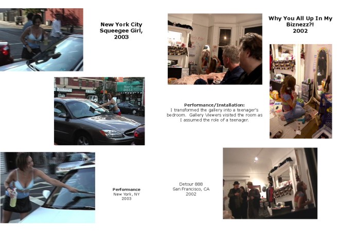 Above image - Limited Situation, 2000 - Performance - I became a prostitute for one night. 4 Walls Gallery, San Francisco, 2000. - Below image - Camel Toe, 2000 - Performance - Trying to put on a very small pair jeans. |