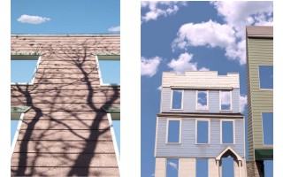 The second set of images is from a photocollage series, Postcard Skies. After moving to Brooklyn in 1997 I began documenting some of my favorite buildings in Williamsburg, enjoying the idiosyncratic artistry with which people in the neighborhood had distinguished their buildings from the adjoining blocks of apartments. Noting the encroaching gentrification and real estate development in Williamsburg, I realized that these quirky homes, would soon be replaced by gleaming modernism. In Postcard Skies, I�ve isolated the fa�ades of my neighbor�s homes and juxtaposed them against dramatic skies, much the way a postcard image of a monument might be framed. The hand cut fa�ade stands precariously, evoking an historic ruin or a theater set. The sky portion of these collages were shot in an area renown for its skies and sunsets�the American Southwest, my home until I moved to New York in 1996.