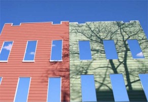 IMAGE DESCRIPTION : Top image from the Light Installation Series: Extended Afternoon, Phase 3, latex paint on existing architecture, hardwood planks, wood stain, varnish, 17 x 24 x 23.5 in (installation view at the Aldrich Museum of Contemporary Art, Ridgefield, CT, 2006) Below left and right, images are from the Postcard Skies Series : far left : pinkfauxwoodgrain, Photocollage, 18 x 30 in, 2004. - left : bluescallopsgreenclapboard, Photocollage, 18 x 24 in, 2004. - right : orangegreenclapboard, Photocollage, 24 x 18 in, 2004. |