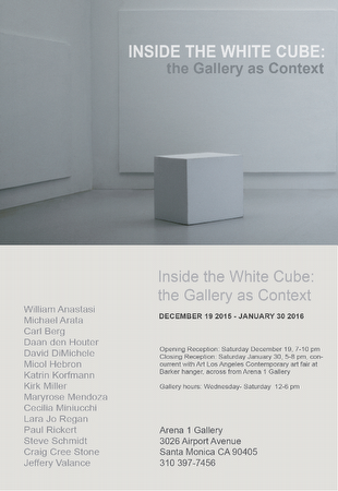 INSIDE THE WHITE CUBE: the Gallery as Context December 19th-January 30th, 2016 Opening Reception: Saturday, December 19, 7pm-10pm Closing Reception: Saturday, January 30, 5pm-8pm Michael Arata • Carl Berg • Daan den Houter • David DiMichele • Micol Hebron • Katrin Korfmann • Kirk Miller • Maryrose Mendoza • Cecilia Miniucchi • Lara Jo Regan • Paul Rickert • Steve Schmitt • Ulay • Jeffery Valance Arena 1 Gallery is pleased to present Inside the White Cube The interior space of the gallery is the ubiquitous backdrop for art. It is the common context that the largest museum shares with the most modest private gallery, the given that every gallery visitor takes for granted. So obvious that we usually don't think about it, the gallery space is the one element that most art (excluding murals and outdoor sculpture) has in common. At one point in the late 20th century, artists started to deal emphatically and deliberately with the space in which the art exists. This attitude regarding art-making coincided with the period of Conceptual Art in the late 1960s, which qu estioned every aspect of the way art was thought about, made, and exhibited. This period also saw the beginning of the widespread use of the gallery as a place to create artworks which incorporated the interior space, usually referred to as installation art. Site-based work done in the gallery has since become a staple of contemporary art, one discipline among many others such as painting and sculpture. Many current artists are now creating concept-driven work that thoughtfully examines the very nature of the spaces in which art is shown. The artists in this exhibition deal with this general idea in very diverse ways. Kirk Miller’s digitally-based works often insert his artworks into historical or contemporary photographs of galleries, changing the meaning of the images and subverting aspects of conventions such as exhibition invitations. Michol Hebrun has done performative works in art museums that involve sitting in the gallery nude in a guerrilla-like intervention into the sanctified space. Jeffery Valance has cut pieces out of gallery walls and preserved them in glass cases like reliquaries. Daan den Houter creates conceptual works that often involve the actual walls of the gallery, such as sealing a 1000 euro note inside a gallery wall for one year, eventually digging it out as gallery viewers looked on. Many works in the exhibition are photo-based. Carl Berg shoots pictures of people in museums seen from behind, focused on a painting and prints them so that the resulting image, hung on the gallery wall, resembles a painting. Paul Rickett shoots formally compelling views of the parts of museums we tend to notice least. David Dimichele creates installation art in miniature galleries in his studio, photographs them and prints large-scale images that reference the documentary installation shot. The exhibition will also include documentary material of a historical nature by artists such as Robert Irwin, William Anastazi, Michael Asher and Chris Burden, who all did ground breaking work of this nature in the 1970s and 1980s. The impulse to include the gallery context as an integral part of the artwork has something in common with an aspect of Modernism itself as defined by the influential mid-century critic Clement Greenberg. Greenberg defined Modernism as a quality where any activity, such as painting, explores the inherent qualities of that medium. The work in this exhibition carries this idea further, to an exploration of the formal and conceptual ideas that embody the way art is exhibited, and the nature of the gallery space. The title, Inside the White Cube, is an homage to Brian O’Doherty’s seminal essays in 1976 in Artforum Magazine, later collected as a book. These influential essays have greatly altered the way many artists, curators, and art writers now perceive the space of the contemporary art gallery. --- ARENA 1 is an exhibition space founded by Santa Monica Art Studios directors Yossi Govrin and Sherry Frumkin. Based in an historic hangar at the Santa Monica Airport, ARENA 1 invites internationally known as well as newly established curators to develop innovative and compelling exhibitions. |