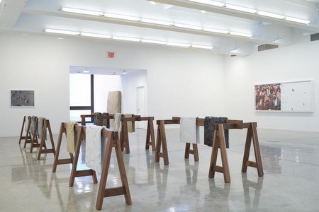 Analia Saban : Backyard February 19 – March 21, 2015 Opening Reception: February 19, 2015; 6-8pm Conversation with the Artist and Johanna Burton, New Museum’s Keith Haring Director and Curator of Education and Public Engagement: February 21, 2015; 11am Tanya Bonakdar Gallery is pleased to announce the second solo exhibition of new works by Analia Saban. Presenting works on both floors of the gallery, Saban invites us into the metaphorical space of the backyard, in which the artist’s new works variously employ wood, marble, found household objects, pigments, and encaustic. In this new body of work, Saban continues to use the traditional elements of painting and sculpture to explore, expand and disrupt the properties of these media through alternative methods and processes. In the current exhibition, Saban brings her radical approach to the realm of the outdoor domestic scene, which becomes a backdrop for the artist’s storytelling. Engaging the history of painting and the possibility of art-making as an alchemical process, Saban continues her investigation of the line between painting and sculpture. Presented in the main gallery, the Draped Marble works employ material that has undergone a transmutation, its once solid form now more akin to fabric than stone. Here, Saban reinterprets traditional sculptural material in order to plumb its relationship to painting, specifically by exposing the minerals in the stone, linking this to pigments used by painters from earlier eras. Formally, the marble’s broken surface betrays variations in the crystalline structures of the stone itself, revealing a range of abstract patterns and rendering stone as canvas. Suggestive of a paint storage room, the upstairs project space presents work that examines painting and pigment through the medium of photography. In the works Scrapped (Paint Storage Room) and Markings (from Paint Storage Room) Saban scrapes the chromogenic emulsion from the photographic paper, manipulating photographic material as pigment. In Paint Cross Sections (from King Tut to Judy Chicago) the composition is built from cross-sections of pigments of famous artworks. Using research from the Getty Conservation Institute, Saban’s approach is akin to that of a scientist or forensic investigator for whom the imagery and information presents a time capsule, or even a portrait of the time at which the object was produced, including the tools and technologies of that culture. Each element of Paint Cross Sections reveals the textural quality of pigments as can only be seen under intense magnification, bringing to light the coarse grained material in Renaissance pigments juxtaposed with the silky, synthetic paints used by the likes of Andy Warhol and other 20th century artists. In the upstairs gallery, the backyard is materialized in a laser-cut diptych, whose imagery brings together elements referenced throughout the exhibition. Conceptualizing the domestic workspace of the backyard as a space for creativity and projects in process, Saban suffuses these ideas into works whose formal elements engage painting in its most minimal state. Bulge (Black) #1, Study for Vestige, and Vestige reimagine the painting as a container for paint, a theme central to Saban’s practice. These artworks serve as repositories and are infused with the surplus ink used to make the Paint Rag series, whose canvases are saturated with differing amounts of printmaking ink to yield their distinct textures. The Paint Rag works variously appear as the tools of painting or the consequences of creativity. The monochromatic palette of this presentation delves into the dichotomy of positive and negative, chromatically and formally. Throughout the exhibition Saban explores the modalities of painting, drawing upon its possible functions and tapping into its historical linkages in order to push beyond its perceived boundaries. Analia Saban (b. 1980 in Buenos Aires, Argentina) lives and works between New York City and Los Angeles. Currently, Saban is included in group exhibitions Variations: Conversations in and Around Abstract Painting at LACMA, CA (through March 22, 2015) and the upcoming Vibrant Matter at Kiosk in Ghent, Belgium (February 14 thru March 29, 2015). The artist was recently featured in Prospect.3 New Orleans, Contemporary Arts Center, New Orleans, LA and An Appetite for Painting, National Museum of Norway, Oslo. Recipient of the Norton Museum’s 2012 "Rudin Prize For Emerging Photographers,” Saban also participated in the Hammer Museum’s, Made in LA group exhibition in 2012. Saban’s works are represented in the collections of the Hessel Museum of Art at Bard College, the Hammer Museum at UCLA in Los Angeles, Museum of Contemporary Art in Los Angeles, Norton Museum of Art in Florida, and Los Angeles County Museum of Art. In 2016, Saban looks forward to her first major solo museum exhibition at the Blaffer Art Museum at the University of Houston, Houston, TX. |
