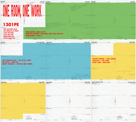 ONE ROOM, ONE WORK 10. July � 21. August 2010 Opening reception: Saturday, 10 July 2010 6-8pm �More than anything, perhaps, creatures of illusion as we are, it calls for confidence in oneself.� Virginia Woolf, A Room of One�s Own (1929) 1301PE is pleased to announce One Room, One Work, a rotating group exhibition featuring a single, important work by nine different artists. One Room, One Work will be divided into three separate group exhibitions each two weeks in length. This permits each artwork to have a room of its own, creating an exhibition that unfurls over time as well as space. The value of having a room to one�s self is championed by Virginia Woolf in her canonical essay, A Room of One�s Own. In this text Woolf attests to a room�s ability to provide personal and poetic liberty. Only when one has the time, space, and means to be alone, to build confidence in oneself, can one partake in larger discussions. This notion is the foundation of One Room, One Work. The exhibition allows each work to have both a singular voice and, as the viewer moves from room to room, conversations with other significant artworks. Over the past number of years, many notable works by 1301PE artists have been exhibited internationally. One Room, One Work combines several of these critically important works along with new works that will be presented in Los Angeles for the first time. By pairing noteworthy work with new work and challenging the conventional group exhibition structure, One Room, One Work aims to slow down the visitor�s viewing experience. Through a series of slowed down, singular experiences, the exhibition intends to question the way we look at and think about art. The schedule for One Room, One Work is as follows: July 10 � July 24 Fiona Banner � Spell 2, 2002 Laurence Aberhart � Morepork (Bird Skins Room #3), 1995 Diana Thater � Dark Matter, 2004 July 27 � August 7 Rirkrit Tiravanija � Untitled (BBQ Corner), 2010 Pae White � Dying Oak, 2009 Jorge Mendez Blake � Art of Loving, 2009 August 10 � August 21 Kerry Tribe � Near Miss, 2005 SUPERFLEX � Copy Right, 2007 Philippe Parreno � AC/DC Snakes, 2010 For additional information please contact Mieke Marple or Brian Butler. |