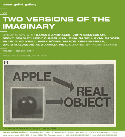 main gallery Opening 25 June 2011 Two Versions of the Imaginary Groupshow curated by Maria Barnas with works by Carlos Amorales, John Baldessari, Becky Beasley, Leidy Churchman, Dina Danish, Ryan Gander, Sharon Houkema, Emre Hüner, Martin Kippenberger, David Maljkovic and Amalia Pica I take a bite of the apple in my hand while I take a bite of the apple in my head. This apple is so much itself, so much an apple, that it can be both object and image. Is it possible to distinguish between object and image? Does the distinction matter? I sense a space between the object in my hand and the image of it in my thoughts. I have invited artists in whom I discern an interest in the space between object and image. It is a territory for thoughts, a place where thoughts can almost be touched. This space – imaginary or not – can at least indicate a direction for the mind to take. This space entices ideas, but it can be restrictive when there’s a need to produce a concrete object. The French philosopher Maurice Blanchot has written a great deal on the subject. I would like to share with you his essay Two Versions of the Imaginary (see www.annetgelink.com) from The Gaze of Orpheus (1907). According to the usual analysis, the image exists after the object: the image follows from it; we see, then we imagine. After the object comes the image. “After” means that first the thing must move away in order to allow itself to be grasped again. The thing was there, we grasped it in the living motion of a comprehensive action – and once it has become an image it instantly becomes ungraspable, noncontemporary, impassive, not the same thing distanced, but that thing as distancing, the present thing in its absence, the thing graspable because ungraspable, appearing as something disappeared, the return of what does not come back, the strange heart of the distance as the life and unique heart of the thing. Work by the following artists will be shown: Carlos Amorales, John Baldessari, Becky Beasley, Leidy Churchman, Dina Danish, Ryan Gander, Sharon Houkema, Emre Hüner, Martin Kippenberger, David Maljkovic and Amalia Pica. (I asked Frances Stark as well, but I’ve heard nothing from her as yet. I finally got hold of Olivier Foulon’s e-mail address last week; I don’t dare invite him at such short notice. The same goes for Paul Perry, who first introduced me to the work of Maurice Blanchot.) You are invited to take part in Two Versions of the Imaginary by sharing your thoughts with me. I would like to see the gallery function as a base for questions about the object-image space. While the artists’ works find out how to relate to each other, new ideas can be formulated. I hope the space between object and image, so hard to grasp, will start to show its edges. Meanwhile I will work on a report based on our findings. I think the title should be Frances, Paul and Olivier , considering that absence is an important theme in Blanchot’s work. With best wishes, Maria Barnas [email protected] UPCOMING Anya Gallaccio Opening 10 September 2011 Wilfredo PrietoNovember/December |