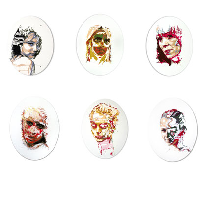 Phrenology Studies of Miley Cyrus, Anna Nicole, Mackenzie Phillips, Lady Gaga, Lindsay Lohan, Kendra Wilkinson, 2010 , each 11 x 14 in oval, cross-stitch on cotton |