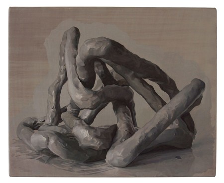 Sitting with the qualities of a mountain If the material properties of a towering peak are to be considered, a familiar mantra in mindfulness meditation, ‘Sitting with the qualities of a mountain’, re-aligns the act of ‘focusing’ as a point of inertia. The process involves a reversal whereby the anthropomorphic is inverted and the human rendered lifeless, bringing it into question. Pathetic fallacy is a human instinct as well as a set of possibilities in how we project our associations and on to what we project. The disparate assembly of objects and artworks in this exhibition ask us the same questions. At what point does Damian Meade’s painting of a lumpen knot of thumbed clay map out the awkward spread of entwined figures, whilst alluding to the charged emotions such an embrace could induce? Like Magritte’s La trahison des images however, this is not a lump of clay let alone a couple caught in the act, merely a simulation of our projection. In the absurdly titled assemblage What can clay hear? Rita Evans presents the same material like a sonic cocoon, under which a rigged up microphone is wired to an amplifier that makes audible any cracks the lump ‘expresses’ as it dries. Lend it your ears for a week and you might have to wait for a month to hear anything at all. Like much of the work in this exhibition the piece hinges on its virtual silence, through an evocation of sound, if not speech. This idea is perhaps most closely echoed in the sculptural text of Patrick Guns, where ‘YHVH.H.O.O.Q.’, appropriates Duchamp’s Mona Lisa readymade, ‘L.H.O.O.Q’ (1919), with the forbidden Hebrew name for God YHVH. Spelled out in the fabricated femur bones of a Bonobo ape, Guns’ Dadaist inscription takes on an impossible phonetic quality, in English at least, beyond the sacrilege of its doctored context. The work of all six artists in this exhibition underline and expose how our process of looking at and thus experiencing objects in the real world is defined by ‘image’ as both a screen and physical reality. |