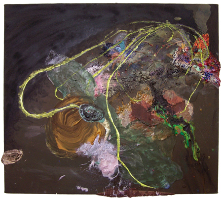 Slipping out New paintings by Mindy Lee Since graduating from the Royal College of Art in 2004, painter Mindy Lee has developed her visceral, commanding abstract works into this arresting series called �Slipping Out�. In each painting, there�s a rectangular core from which a swarm of energy and colour explodes across the canvas, riding the edge between seduction and disgust. Just as we watch horror movies to relish our sofa safety from the slash and gore, Lee�s exquisite layers, rings and ridges of what look like snot, smoke and gunk, emit such an infectious force that we can only admire the adrenalin that spills out over the borders of the frames themselves. The spoors of colour maintain an ugly coherence, as if the party balloons have long burst but the fun goes on. Here is pattern breaking down, cells rioting, communication coagulating in an overload glut of signs and codes. Like Teresita Dennis�s work, Lees� paintings evolve from a process that traces the artists� physical interaction with the canvas. Lee uses this process as a tool to explore events, which unravel within the paintings. These events are regurgitated or invented moments that resemble a range of imagery from eco-disaster or bio warfare to computer meltdown or a brain haemorrhaging. In �Sumpter�, 2007, a trail of knotty lumps of paint frosted in a thick glaze resemble a fractured spinal cord, while the mass that detonates above it seems to suggest a cloud of disorientated, pesticide-poisoned bees unable to navigate their way back to the hive. While the works appear anarchic, frenzied, it�s taken months to accrue such complex surfaces, with the artist applying triple pours, surfaces rubbed away and threads manipulated over the canvas as the paint dries to create colour bleeds in �Doll�s House�, 2007 and in �Birdsweb�, 2008. �With their compositional constancy, these strong paintings could belong to the emerging body of work dubbed Landscape Trauma, which uses a vibrant and violated abstraction to underscore anxiety about a corrupted environment in which we inhabit. There�s no didacticism in this slow apocalypse. Rather it�s electrical, infectious work that if connected to the national grid could provide a massive surge of alternative energy. As alienating, alienated topographies, these paintings are wonderfully impolite at a time when much painting chooses graphic cleanliness or inexpressive, muted tones.� Critic, Cherry Smyth |