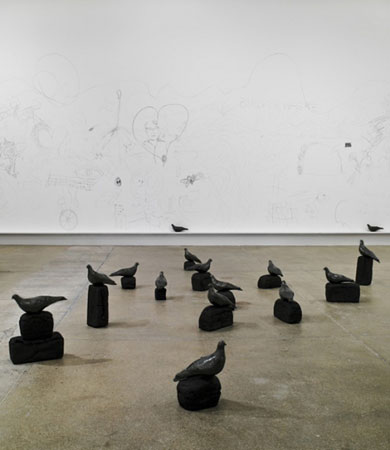 TONICO LEMOS AUAD Silent Singing SEP 13 - OCT 18 Opening reception: Saturday, Sep 13th 6 - 8pm CRG begins its season with the first New York solo exhibition of London-based Brazilian artist Tonico Lemos Auad. The installation includes an arrangement of cast graphite pigeons on the gallery floor titled "Quatro Ventos" four winds. In this work some of the dulled metallic birds are mounted atop loaves of blackened burnt bread while others, that form an interactive component, are loose and meant to engage the viewer -who is invited to use them to draw or write on the gallery wall. In addition, a series of portraits, also depicting pigeons, hang on the gallery wall, each adorned with a semi-irregular bulging picture frame made from baked bread. Other works include an arrangement of sprouting sweet potatoes that spell out the word "CLAIRVOYANT". Auad engages the transitory through the use of materials that we take as succinctly impermanent and fading; incorporating such things in the past as fruits, vegetables, and plants into his works. The fragile and ethereal presence that these objects provide is amplified even more so by his delicate treatment of them. While such precedents exist like Yoko Ono's distinctively stark "Apple", 1967 -not wholly dissimilar in its quiet and poetic placement, Auad's hand is clearly present in his work that has its foundation in the essentialized creative act of mark making or drawing. Sometimes conventionally and other times not so. With such seminal works as "Drawings on Banana" 2001 -where Auad used a needle to prick the skin of bananas causing them to ripen in areas, revealing over time blackened tattoo-like drawings on the fruit's surface that eventually disappeared as the fruit continued to ripen. Auad's process might seem to focus on the momentary with a capricious disregard for its need of continual replenishment in order to exist at times, though like Ono, that is precisely the point that makes his work resonate with such lucid, though perhaps inaudible, clarity... "Silent Singing" as it might be. His works are engagements with his environment on the most intimate of levels, even seemingly accidental at times; as if through the busy fray of daily life something as innocuous as a forgotten potato on the kitchen counter -revealed many weeks later to have begun sprouting and perhaps for a moment suggesting an auspicious vision. It is the beauty of the commonly overlooked that can, through Auad's delicate placement and treatment, yield such poetic repositories of a shared personal experience that in their slow impermanence become like memories that have been caught just long enough to appear as if stopped altogether. The works in this exhibition mark a significant culminating point for Auad where his range of personal process and medium have become combined and accessible through an open invitation with the viewer. The focal work "Quatro Ventos" extends Auad's talent for transforming the everyday through alchemical means to a dialogical one where the viewers themselves become an active agent in the transformation; dissolving the representational object into the abstract and gestural quite literally -as the pigeons eventually will disappear into a specific and current cultural script within the gallery space that eventually vanishes over time as well. CRG Gallery, 535 W 22ND ST, New York City Transportation: C and E trains to 23rd St at 8th ave |