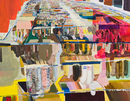 LISA SANDITZ: Sock City October 23rd - November 29th, 2008 Opening reception: Thurs Oct 23rd 6-8pm Lisa Sanditz� third solo exhibition at CRG is the culmination of her interest and travels in recent years that have resulted in a new body of work inspired by the Chinese commercial landscape. The exhibition includes works on canvas and paper and is accompanied by a catalog with essays by Jonathan Franzen and Barbara Pollack that documents the entirety of her work on the subject. For the last ten years, Sanditz' paintings have focused on the various forms in which the marketplace and wilderness intersect, overlap, and inform each other. Subjects in her paintings have included such things as sporting events, shopping malls, residential development and tourist destinations. Through a complexity of combined forms, unconventional approaches clashing with more historically-anchored painting techniques, Sanditz has described the brash and metastasizing flux of the American landscape. Through her continued investigation of these places came an awareness of multinational corporations and sprawling urban and exurban areas not just in America, but all over the world. With a growing interest in the broader notion of the American landscape, it became clear that all the familiar commodities that we buy on a daily basis, everything from toothbrushes to cars, have their roots in distant and unfamiliar places, �places that we have unknowingly given birth to in our unsurpassed ability as Americans to consume. In the winter of 2006-2007 Sanditz traveled to single-industry towns in China; places whose industry is focused on the production of specific and often singular products. These places, located largely in China's Pearl River Delta have been unofficially renamed by the items they produce: Sock City (Yiwu), Shoe City (Jinjiang), Oil Painting Village (Shenzhen) are just a few among many others. These burgeoning micro-economies dedicated to producing fantastic amounts of a single commercial product for export have dramatically transformed the Chinese landscape; furiously shifting the pastoral to the industrial. Sanditz describes these places in her signature amalgam of fancifully ornate and pictorially bound marks; forming seemingly endless seas of product showrooms, factories, and neon signs that emerge from the murky smog saturated backgrounds of her canvas. For Sanditz this body of work evidences not a cultural divide but rather a convergence of two cultures economically. Perhaps not a symbiosis, but an awareness of how intrinsically linked and mutually impacting each has been and continues to be. Sanditz plans to return to China this winter to further investigate this relationship with the generous assistance of a Guggenheim Fellowship that she received in 2008. Next Exhibition: O Zhang "The World is Yours (But Also Ours)" Dec 12, 2008 - Jan 31, 2009 |