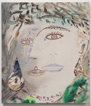 Oil, flashe, pen, glitter, thumb-tack, tie-dyed cut canvas on canvas 23 x 20 inches |