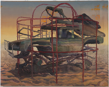 DANIEL DOVE January 16 - February 20, 2010 Cherry and Martin presents its second solo exhibition of Daniel Dove�s large-scale oil paintings dealing with pictorial construction and the manipulated environments of contemporary America. Daniel Dove�s recent paintings depict structures in states of transition, either half-ruined or partially reconstructed. The subjects of Dove�s pictures range from suburban landscape detritus to charged contemporary artifacts (such as reconstructed bombed airplane fuselages), meticulously re-built to understand or reinvent their original trauma. In this rebuilding, Dove�s objects reveal a longing for completeness that can never be restored, much the way that his highly composed canvases offer distilled, ordered fictions based on chaotic and often dangerous real-world events. Daniel Dove�s process combines naturalistic depiction with reflexive aspects that refer to image-making and/or painting. This could be emphasis on painting�s material (gesture and other process evidence), reference to genres of abstraction (all-over, geometric), or the idea of an image within the image that doubles the picture plane (such as a billboard, stage flat, or movie set). By working multiple concerns within each work, Dove�s paintings echo the re-assembled or staged aspects of his subjects, where unity is always both present and tenuous. This balance of depictive and reflexive ambitions makes both narratives�that of studio thinking and that of the world external to art�equally important in Dove�s work. Daniel Dove received his MFA from Yale University. His work has been featured in such exhibitions as Fracture and Fidelity, curated by Chris Bedford, at RISD (Providence, RI); Made in California at the Frederick R. Wesiman Museum of Art (Malibu, CA); and Dreaming of a More Better Future, curated by Saul Ostrow, at the Cleveland Art Institute (Cleveland, OH). |