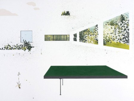 blaise drummond the bright hours The exhibition title makes reference to Le Corbusier�s Villa Savoye in the small French town of Poissy-sur-Seine near Paris that is also known as the Villa Les Heures Claires. The works of Blaise Drummond are experimental set-ups in the field of fine arts. Over the immaculate white of the canvas, his repertoire of set pieces are (re)distributed to create constantly changing arrangements. These are fragments of the utopias of the 19th and 20th century, of Romantic yearnings for nature and enlightened Modernity; these polarities confront each other and thus create new connections. His works always oscillate between the failure of this Romantic idea and the discovery of a new beginning. Influenced by Post-Minimalist concepts, Drummond cites the reduced, abstract language of the 1960s and 1970s and transforms this into a semantic system that now belongs to our general culture. Drummond refers to these roots using architecture by Le Corbusier and van der Rohe, for example, seeing them as locations of idealised human existence, which he longingly evokes in his pictures and simultaneously presents as an artificial construct. In his pictures, the architectural icons of Modernity come together with drippings or decalcomania in plant form, profane objects or fragments of nature. Every element appears to float in an unsteady balance on the white of the canvas as if it had found its ideal location, if only for a moment. Then the artist permits the viewer to expose this completely staged harmony as a illusionary world. Drummond�s examination of the past does not produce any nostalgic d�j�-vu; instead, it directs our gaze towards the present through the mirror of our history. The exhibition title makes reference to Le Corbusier�s Villa Savoye in the small French town of Poissy-sur-Seine near Paris that is also known as the Villa Les Heures Claires. Blaise Drummond was born in Liverpool in 1967 and lives in County Longford, Ireland. He graduated from the National College of Art and Design (Dublin) in 1994 with First Class Honours in Fine Art Painting and Art History and received an M.A. in Fine Art Painting at the Chelsea College of Art in London four years later. He has had solo exhibitions in Aliceday (Brussels), Galerie Loevenbruck (Paris), Andrew Mummery Gallery (London), Rubicon Gallery (Dublin), the Castlefield Gallery (Manchester), Stedelijk Museum Aalst (Belgium) and the Crawford Municipal Gallery of Art (Cork). He has also participated in group shows with the Ikon Gallery (Birmingham), Irish Museum of Modern Art (Dublin), the Bluecoat Gallery (Liverpool) and many more, and was selected twice for the John Moores exhibitions in the Walker Art Gallery (Liverpool) and in the �Utopias� show at the Douglas Hyde Gallery (Dublin). catalog: Blaise Drummond Mus�e de l�Abbaye Sainte-Croix, Les Sables d�Olonne, France 2006 Cahiers de l�Abbaye de Sainte-Croix, no. 106 |