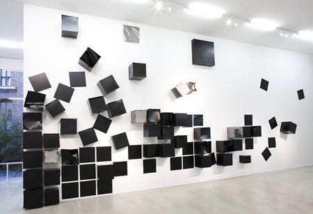Katja Strunz - Einbruchstellen Contemporary Fine Arts freut sich, die Einzelausstellung �Einbruchstellen� mit neuen Arbeiten von Katja Strunz bekannt geben zu d�rfen. Die in der Ausstellung gezeigten Skulpturen von Katja Strunz ragen mehr denn je in den Raum hinein, sind sichtbar raumgreifender geworden. Ihre ab Ende der neunziger Jahre zu einem stilistischen Erkennungsmerkmal gewordenen Faltarbeiten f�gen sich in der Ausstellung �Einbruchstellen� als Teile eines Ganzen ein. H�ufig st�rt Strunz das Gleichgewicht der Ausrichtung dieser Faltarbeiten dadurch, dass sie einen der h�lzernen oder metallenen F�cher in unmittelbarer N�he zu weiteren Elementen unterschiedlicher Materialit�t platziert. Thematisieren diese Kompositionen vor allem eine Auffassung von Zeit, insbesondere von vergangener Zeit? Sicherlich widersetzen sich die Arbeiten von Katja Strunz einer rein zukunftsorientierten Zeitebene. Schon auf Grund des verwendeten Materials sind die Arbeiten in verschiedenen Zeitdimensionen verstrickt. Bereits in einer fr�heren Arbeit (Brunnen, 2000) befasste sich Strunz mit einer treppenf�rmigen Skulptur, eine alte Metalltreppe, einem echten Berliner objet trouv�, welches die K�nstlerin in einem verlassenen Schwimmbad fand und zur Skulptur erkl�rte. Eine �hnlich fragile und mitgenommene Kupfertreppe (Ohne Titel, 2008) empf�ngt den Besucher nun im vorderen Raum des ersten Stockwerks der Galerie: die sichtbar gealterte und mit einer gr�nlich oxidierten Spur �berzogene Treppenskulptur scheint ins Nichts zu f�hren und bietet dem Betrachter weder Halt noch Ausweg. Eine an der benachbarten Wand h�ngende Papiercollage kommuniziert mit der Treppenskulptur. Der bei Strunz immer wieder auftauchende Begriff der �Stagnation� scheint in dieser Collage mit den herabsteigenden Buchstaben den Gang ins Nichts r�ckw�rts zu unterstreichen. Die gr��te Skulptur der Ausstellung im oberen Stockwerk (Der m�de Traum, 2008) besteht aus mehreren, wei� gestrichenen Holzelementen, deren Gesamtgr��e einen unabh�ngigen, sogar begehbaren Raum entstehen l�sst. Teile der Wand des Galerieraumes scheinen sich hier verselbst�ndigt und aufgeb�umt zu haben. All den an der Wand verankerten Faltarbeiten, den Kuben, Collagen und Materialbildern haften die Spuren der Zeit, der Vergangenheit und einer gewollten Unvollkommenheit an. Die �ber zwei Stockwerke hinweg einfallenden Kuben der Arbeit Memory Wall von 2008 sind eingedellt, in Aufl�sung begriffen, sie laufen Gefahr, in die Zweidimensionalit�t zu zerfallen und auseinander zu driften. Fast scheinen sie zu der reinen abstrakten Form eines schwarzen Quadrats zur�ck zu wollen. Oder sind es, auf einer weiteren Ebene, Traumelemente, die in unsere Wirklichkeit und Gegenwart fallen? Die Werke von Katja Strunz kann man als Einbruchstellen benennen, durch die dasjenige, was jenseits des Kunstwerks liegt, in unsere Sprache und in unser Zeitgef�hl hineinzuragen vermag. �Einbruchstellen� ist die erste Einzelpr�sentation der deutschen K�nstlerin bei Contemporary Fine Arts. Katja Strunz (*1970) lebt und arbeitet in Berlin. Katja Strunz - Einbruchstellen Contemporary Fine Arts is pleased to announce the solo exhibition �Einbruchstellen� with new works by German artist Katja Strunz. The sculptures by Katja Strunz shown in the exhibition protrude into the room more than ever; they have become more expansive. Her folded works, which became a stylistic trademark of hers in the late 1990s, are incorporated as parts of a whole. Frequently, Strunz disrupts the balance of the alignment of these folded works by placing a wooden or metal fan in direct proximity to further elements made from different materials. Do these compositions take mainly a notion of time, especially of past time, as their theme? Certainly Katja Strunz�s works resist a time level purely oriented to the future. The materials she uses implicate the works in different time dimensions. Already in an earlier work (Brunnen, 2000) Strunz engages with a sculpture shaped like stairs, an old metal set of stairs � a real Berlin objet trouv� which the artist found in an abandoned swimming pool and declared to be a sculpture. A similarly fragile and battered flight of copper stairs (Ohne Titel, 2008) now greets the visitor in the front room on the gallery�s first floor: the visibly aged sculpture, bearing green traces of oxidation, seems to lead nowhere, and offers the beholder neither a hold nor a way out. A paper collage hanging on a wall close by communicates with the stairs sculpture. The term stagnation, which keeps appearing with Strunz, in this collage with descending letters seems to underline backwardly the path into nothingness. The largest sculpture in the exhibition, on the upper floor (Der m�de Traum, 2008) consists of several wooden elements painted white, and together they create an independent space that can be entered. Parts of the wall of the gallery room seem to have become independent and reared up. All the folded works anchored on the wall, the cubes, collages, and material pictures bear the traces of time, the past, and an intentional imperfection. The cubes (Memory Wall, 2008) entering over two floors are dented, in a state of dissolution, and they are in danger of disintegrating into two-dimensionality and drifting apart. It is almost as if they want to return to the pure abstract form of a black square. Or are they, on another level, dream elements falling into our reality and present? Katja Strunz�s works can be seen as points of rupture (Einbruchstellen), through which what lies beyond the work of art can protrude into our language and our sense of time. �Einbruchstellen� is the artist�s first solo show with Contemporary Fine Arts. Katja Strunz (born in 1970) lives and works in Berlin. |