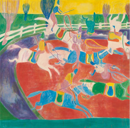 Contemporary Fine Arts freut sich, eine Einzelausstellung mit Tal R (*1967) bekannt geben zu d�rfen. Der als Tal Rosenzweig in Tel Aviv geborene d�nische K�nstler zeigt zehn neue Arbeiten auf Leinwand. In der neuen Werkgruppe vollzieht sich ein radikaler Bruch mit Tal Rs vorheriger Technik. Der K�nstler geht von der oft pastos aufgetragenen �lmalerie �ber zu einer f�r ihn �berraschenden neuen Technik. Hasenleim und Pigmente werden gemischt und unmittelbar auf die ungrundierte Leinwand aufgetragen, wodurch ein matter Oberfl�cheneffekt, �hnlich dem Effekt eines Freskos entsteht. Auf einigen Arbeiten zeichnet der K�nstler anschlie�end mit Wachskreide auf die bemalte Oberfl�che. Nach eigenem Bekunden �hnelt Tal Rs Malerei einem Feuertopf, in den er �alle Arten von Material� hineinwirft. Dabei zeugen seine farbkr�ftigen Gem�lde nicht nur vom Einfluss der Subkultur und der uns und ihn t�glich umgebenden Bilder des Alltags wie Filme, Musik, Graffiti oder etwa die Wandmalerei einer Berliner 20er Jahre Bar wie in �We are the elephants�, sondern vereinen mit diesen auch Elemente der Hochkultur und der Kunstgeschichte. Die Gem�lde haben meist einen schematisierten Bildaufbau. Die Szenen und Geschichten ruhen auf einem breiten horizontalen Untergrund, der sich konstant durch Tal Rs Werk zieht. Die narrativen Bildinhalte werden durch den geschichteten Bildaufbau wie auf einer Art B�hne pr�sentiert. Ein r�umlich wirkender, theater�hnlicher Aufbau wie in �Night Tingel Tangel� sowie kulissenartige H�ngevorrichtungen wie in �Blind Date� oder die Zirkusszenerie in �Elephant behind clown through keyhole� unterstreichen diesen Effekt. Der Betrachter und der K�nstler selbst nehmen so eine Zuschauerrolle ein, die es ihnen erm�glicht, Einblicke in eine andere Welt zu gewinnen, sei es der Blick auf eine B�hne, durch ein Fenster mit Br�stung wie in �The Call� oder auch ein Schl�sselloch. Dies ist die siebte Einzelausstellung des von Contemporary Fine Arts exklusiv vertretenen K�nstlers. Tal R lebt und arbeitet in Kopenhagen. Contemporary Fine Arts is pleased to announce a solo show with TAL R. The Danish artist, who was born in 1967 as Tal Rosenzweig in Tel Aviv, is showing ten new works on canvas. The new group of works marks a radical break with Tal R�s previous technique. Whereas before, he often applied his oil paints in a pastose manner, he now mixes animal glue and pigments and applies this mixture directly to an unprimed canvas. This creates the effect of a slightly dull surface, reminiscent of a fresco. On some works, the artist then draws with wax crayons on the painted surface. According to the artist, his painting is like a hot pot into which he throws �all kinds of material.� His colourful paintings thus do not just reflect subcultural influences as well as images from everyday that surround us all, such as films, music, graffiti, or, for example, a fresco of a Berlin bar from the 1920s, like in We are the elephants, but they combine these with elements from high culture and art history. The paintings usually are structured rather schematically. The scenes and narratives rest on a broad horizontal underground which is a constant in Tal R�s oeuvre. Through the layered structure the narrative content is presented as if on a kind of stage. This effect is emphasized by the spatial composition reminiscent of a theatre, such as in Night Tingel Tangel and a suspension contraption for a backdrop, such as in Blind Date, or the circus scenery in Elephant behind clown through keyhole. The beholder and the artist himself take on the role of the audience, which enables them to gain insights into a different world, be that the view of a stage, through a window with a parapet, or a keyhole. This is the seventh solo show of works by Tal R, who is exclusively represented by Contemporary Fine Arts. Tal R lives and works in Copenhagen. |