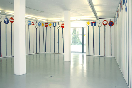 Cristina Guerra Contemporary Art presents �Recession�, the first solo show in the gallery of the German artists Tatjana Doll (Burgsteinfurt, 1970). Tatjana Doll is best known for her large-scale paintings in which she employs a vocabulary assembled from images of life in the contemporary cities. Always figurative, and using recurrent motifs, her work can be broken down into several thematic groups: vehicles, containers, seats (stadiums, cinemas) and urban signage. Common places, easily recognizable, that think the visual repertoire of our contemporary society. Her painting is clear and direct. Admittedly bi-dimensional, Doll moves away from a key characteristic in painting, illusion, to present canvas upon which a sole element is portrayed on a white background. This choice to employ pre-existing images is interrelated with the artist�s will to deny the originality drive. The immediate reading that the works make possible, allow Doll to empty the signs of their meaning allowing the artist to concentrate solely on the image itself. By not making the decision on the content, Doll limits her subjectivity to her intervention in the search for the most intense way to paint. At Cristina Guerra Contemporary Art Tatjana Doll presents a group of 70 paintings of road signs. The artist decided to extend the poles in order for the sign itself to be located close to the ceiling. This decision bores two consequences, a violent encounter with a forest of bars (a grid that reminisces some minimalist interventions), which encloses the spectator within the space of the gallery; and the effort-making necessity to find the focus of the painting. This installation, specifically conceived for Cristina Guerra Contemporary Art, reflects the artist�s observation of the profusion of signs on the Portuguese roads and materializes her rumination about a society that, in seeking sophistication, needs to implement more and more rules of conduct. A society, which is increasingly oppressive of its citizens and that constantly imposes the paths they are to circulate. Tatjana Doll presents as well a group of paintings portraying one truck, three Lamborghinis and a couple of Dollar rolls. The whiteness of the canvas representing an erasure of the original context, allows the spectator to locate the object in an imaginary setting. The title of the exhibition although with a clear economical association (which is also true for the paintings themselves) relates not to the art market but more towards a stagnation of growth (road signs) as well as a suspension of content of the paintings. Until July 13th the work of Tatjana Doll can also be seen in the exhibition �Institutional and Poetic Violence� at the Museu de Arte Contempor�nea de Serralves, Porto. |