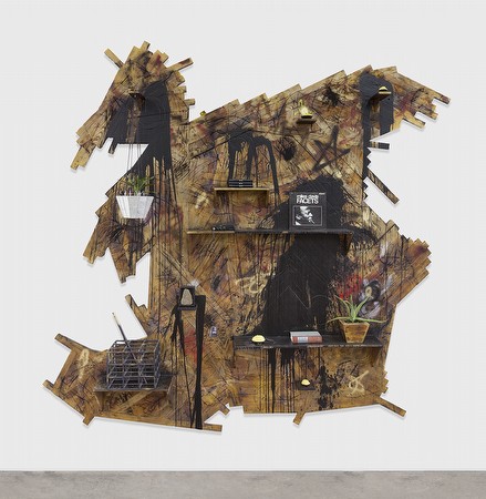 Rashid Johnson - ISLANDS Opening reception: Saturday, September 13, 6:00-9:00pm David Kordansky Gallery is pleased to announce Islands, an exhibition of new work by Rashid Johnson. This is the artist's third solo show at the gallery, and the gallery's inaugural exhibition at its new location at 5130 W. Edgewood Place, Los Angeles. The show will open on September 13 and run through October 29, 2014. An opening reception will be held on Saturday, September 13, from 6:00pm until 9:00pm. Spanning both gallery spaces, Johnson's two-part exhibition features new wall- and floor-based sculptures. These include a hollow fifteen-foot high pyramid, shaped vitrine-like tables, and erratically contoured shelf works. Broadly taking a cue from Richard Wright's novel Native Son, and its antiheroic characterization of the African-American male, the sculptures embody an extreme unbound energy. In structure, material, and process, they express a tension unprecedented in Johnson's practice. In one gallery Johnson presents the solitary pyramid form as a perverse minimalist ruin. Comprised of identical open steel cubes, welded together to erect a progression of stacked blocks, the sculpture evokes the cubic structures of Sol LeWitt, realized at a habitable scale, as well as Carl Andre's modular works. Accordingly, Johnson has "occupied" this empty form. He has loaded it with signifying objects and dynamic matter from his artistic cosmology. The process of accumulation, which will be completed in Los Angeles, expresses yearnings both transgressive and assimilative. The pyramid, understood as a living organism or an externalized psyche, suggests an existence isolated by and at odds with an idealized, systematic order. Despite its faceted depths, the gridded sculpture is formally a cage or, following the exhibition title, an island. In contrast to this hermetic monument, Johnson populates the second gallery with a diversity of intimate, shaped wood table and shelf sculptures. Each resonates as a further island form, here scaled for interior space and domestic use. In his new table typology, each angular form's shaped and recessed top extends out beyond a base with a matching geometric profile, such that the top appears to hover in space. Johnson filled each top with shea butter, and then drew abstract marks into the resulting slab. Finished with a sheet of topping glass, each sculpture displays an expressive pictorial plane, but also provides a functional surface. Each is, to quote Johnson quoting Lawrence Weiner, "something to put something on", and a shared site for congregation. In the accompanying wall-mounted shelf sculptures, Johnson aggregates marks and material with a layered intensity. This complexity begins with the wood substrate, in which he assembles thicket-like crossings of red oak planks into biomorphic shapes. Johnson allows the outermost ends of the planks to extend irregularly, forming a jagged, seemingly splintering edge to each form. Upon this surface he then enacts his most elaborate, multi-step process of mark-making to date, which includes layers of spray paint, branding, scratching, poured soap and wax, and finally arrayed shelves and objects. The resulting compositions, visually unpredictable at every level, are at once amorphous, expansive, and volatile. Johnson's practice regularly reimagines popular narratives that shape contemporary African-American identity, remixing them with his own personal history, and his growing lexicon of formal signifiers. His early "New Negro Escapist Social and Athletic Club" celebrated a supernatural black elite, and he has since more ambivalently adopted the perspective of African dictators, or Camus's L'Etranger. Here, for the first time, Johnson generates a body of work from an antiheroic stance. The attitude recalls outlaw Ivanhoe Martin, as depicted by Jimmy Cliff in The Harder They Come, or Sweet Sweetback, Melvin Van Peebles's proto-Blaxploitation icon, but most prominently Bigger Thomas, Wright's protagonist of Native Son, an impoverished black youth driven to multiple murders by the anxiety, anger, fear, and loneliness inscribed by his social plight. The forms of Johnson's Islands play out a like meta-narrative in their dissociation from Johnson's studio to the white cube and beyond, where not only are their internal mechanics on display, but each becomes an isolated figure subject to the pressures of a larger social field. Rashid Johnson (b. 1977) has recently presented solo exhibitions of his work at The George Economou Collection, Athens; the Museum of Contemporary Art, Denver; Ballroom Marfa, TX; South London Gallery; SculptureCenter, Long Island City, NY; Kunstmuseum Kloster Unser Lieben Frauen, Magdeburg, Germany; and the Indianapolis Museum of Art. A mid-career survey of his work entitled Rashid Johnson: A Message to Our Folks, was organized by the Museum of Contemporary Art, Chicago, and traveled to the Miami Art Museum; the High Museum of Art, Atlanta; and the Mildred Lane Kemper Art Museum, St. Louis. Recent group exhibitions include Variations: Conversations in and Around Abstract Painting, Los Angeles County Museum of Art; In the Holocene, MIT List Visual Arts Center, Cambridge, MA; American Exuberance, Rubell Family Collection, Miami; ILLUMInations, International Pavilion, 54th Venice Biennale; and Secret Societies. To Know, To Dare, To Will, To Keep Silence, Schirn Kunsthalle, Frankfurt and CAPC de Bordeaux. In December, Johnson will open a solo exhibition at Kunsthalle Winterthur, Switzerland, and his "Cosmic Slop" paintings will be featured in the group exhibition The Forever Now: Contemporary Painting in an Atemporal World, curated by Laura Hoptman, at the Museum of Modern Art, New York. |