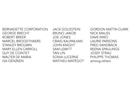 The Evryali Score Curated by Olivia Shao 525 & 533 West 19th Street June 29 - July 30, 2010 Opening reception: Tuesday, June 29, 6 - 8pm Walkthrough with the curator: 6 - 6:30pm Featuring works by: Bernadette Corporation, George Brecht, Robert Breer, Marcel Broodthaers, Stanley Brouwn, Mary Ellen Carroll, Guy de Cointet, Willem de Rooij, Isa Genzken, Jack Goldstein, Bruno Jakob, Joe Jones, Craig Kalpakjian, John Knight, Sam Lewitt, Tan Lin, Sonia Lucerne, Mathieu Mat�got, Gordon Matta-Clark, Nick Mauss, Dave Miko, Max Neuhaus, Laurie Parsons, Fred Sandback, Reena Spaulings, Josef Strau, Philippe Thomas, among others. June 5, 2010 Klaus Biesenbach Curator at Large Museum of Modern Art 11 West 53rd Street New York, NY 10019 Dear Klaus, I hope this letter finds you well � and congratulations on the success of the �Greater New York� show. After seeing �The Baghdad batteries,� the first of PS1's Rotating Gallery exhibitions, I invited its curator Olivia Shao to organize the summer show at my gallery. I would therefore like to request to borrow �The Baghdad batteries� exhibition after it closes at PS1, as Olivia has the idea to reinstall that show in one of the galleries here. Then, in the adjacent gallery, she will curate a new exhibition that will use the existing show as a point of departure. The entire two-gallery exhibition will be given a new title, and we are planning to open on June 29th. We very much look forward to being in contact with your team at PS1 regarding practical matters of transportation, etc. In the meantime, thank you very much for your consideration of our request. Best regards, David Zwirner |