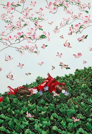 The Front Room is Proud to Present: Emily Roz "The Rutting Season "Sept. 9th-Oct. 9th, 2011 Reception Friday, Sept. 9th. The Front Room Gallery is proud to present, “The Rutting Season,” a solo exhibition of new works by Emily Roz. This series of paintings play with the volatile activity of animals com- peting to satiate themselves amidst a perpetual spring of bloom and decay. Through heightened realism, flowers, seedpods, branches and carcasses coexist in a world of dreamlike unreality. As the animals in these scenes fight for position under the teasing petals, the muted color backdrops preserve the freshness of such eroticism found in nature and violence. The palette in Roz’s paintings captures the deep hues and tones of a dawn and dusk atmosphere, which are the prime hunting times for the predatory animals she depicts. The ‘rut’ is the breeding season of ruminant animals, which makes them vulnerable to predators, as they are distracted with their desire to mate. Emily Roz captures the tenuous balance between this animalistic desire to mate and propagate, paired with the need to feed and kill. These carnal urges are reflected in their flora counterparts with blossoming flowers, sprays of budding tips and foreboding barren branches. The luminous arousal of either flora or flesh is temporal, regardless of the promise of one’s cyclical return and the other’s inevitability. Roz’s paintings present the ambition of spring and the voracity of nature through compositions of stark, fruitless tree limbs, echoed in the understructure of delicately interwoven curtains of blooms and blankets of lush green. The balance of these selected floral components with the harsh realism of perched predators and open flesh heightens our awareness of our own vulnerability and natural desires. |
