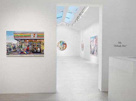 Mr. | 21/10/2008 - 10/01/2009 Nobody Dies Bharti Kher | 21/10/2008 - 10/01/2009 Sing to them that we listen Pharrell Williams | 21/10/2008 - 10/01/2009 Perspectives Mr. | 21/10/2008 - 10/01/2009 Nobody Dies 10, impasse Saint Claude 75003 Paris �2007 Mr./Kaikai Kiki Co., Ltd. All Rights Reserved. Avec ses personnages de Lolitas d�tourn�s de l'imagerie manga, Mr. s'est impos� dans les interstices s�parant l'ironie de la candeur. Sur cette repr�sentation ambigu� de l'�merveillement pub�re, il a conjugu�, � une autre �poque et dans un autre registre culturel, l'innocence feinte de l'h�ro�ne nabokovienne. On se souvient l� notamment de ses oeuvres semblant reprendre le personnage d'une jeune Heidi en petite culotte dans les Alpages. A partir du c�l�bre dessin anim� r�alis� par Isao Takahata d'apr�s un mod�le europ�en (1974), Mr. a op�r� sur grands formats un l�ger d�calage jouant tout autant sur les questionnements culturels du Japon d'aujourd'hui que sur la probable perversit� d'une jeune fille qui semble refuser la victimisation d'un d�terminisme religieux (croire, prier et souffrir en silence) au profit d'un salut passant par un libre arbitre militant (l'�mancipation par ses propre choix). Remarqu� au sein du manifeste Super Flat, remettant en perspective la culture du Japon selon l'�ternelle confrontation de la tradition et de la modernit�, Mr. �volue pr�cis�ment dans les paradoxes d'un Orient occidentalis�. Et que l'on peut percevoir dans ses immenses toiles expos�es depuis dix ans � Tokyo, Osaka, Nagoya comme � Chicago, New York, Minneapolis, Londres ou Paris. N� en 1969 � Cupa, Mr. avait d�j� eu le temps de s'interroger sur la place, la l�gitimit� et la reconnaissance d'un artiste avant de rejoindre Takashi Murakami dans le Super Flat et d'impulser le collectif Hiropon/Kaikai Kiki. Tout avait commenc� ainsi. Durant ses trois ans d'�tudes artistiques, il avait mis en pratique tout ce dont il s'�tait impr�gn� lors de sa pr�paration � l'�cole des Beaux-Arts. Il s'agissait de l'Arte povera (pour l'influence italienne) et du pop art de Rauschenberg (pour l'influence am�ricaine). Aux avant-gardes de la nouvelle peinture, comme on parlerait de la Nouvelle Vague, et sensible au travail de Sandro Chia et Francesco Clement, ses oeuvres r�alis�es � partir d'objet r�cup�r�s de toute sorte d�routent dans un premier temps. Mr. r�alise des montages m�lant speakerines, pr�sentateur et autres stars de la m�t�o dans des vid�os de dix-huit heures. Il commence � esquisser des personnages de Lolitas sur des re�us, des tickets. Arte povera: cet art pauvre autour duquel Mr. n'avait cess� de tourner lui offrira l� une reconnaissance critique. With his Lolita figures borrowed from manga imagery, Mr. has made a name for himself in the space separating irony from candor. In this ambiguous representation of pubescent amazement, he has combined the feigned innocence of Nabokov�s heroine with another era and another cultural register. What comes to mind are his works that seem inspired from the figure of the young Heidi in her underwear in the Alpine meadows. Mr. drew from the famous cartoon made by Isao Takahata after a European model (1974), altering it on large format works that deal as much with the cultural self-examination in Japan today as with the probably perversity of a young girl who refuses the victimization of a religious determinism (believe, pray and suffer in silence), in favor of salvation that comes through free will (emancipation through one�s own decisions). First noted as part of the Super Flat manifesto that challenged Japanese culture in terms of the eternal confrontation between tradition and modernity, Mr. works with the paradoxes of a westernized East � as can be seen in his immense canvases that have been exhibited in the last ten years in Tokyo, Osaka and Nagoya, as well as in Chicago, New York, Minneapolis, London and Paris. Born in 1969 in Cupa, Mr. had already explored the status, legitimacy and recognition of artists before joining Takashi Murakami in Super Flat and participating in the Hiropon/Kaikai Kiki collective. This is how it all began. During his three years of art studies, he incorporated everything he had learned during his preparation for the School of Fine Arts: Arte Povera (Italy) and Pop Art through Rauschenberg (United States). In the avant-garde of new painting, in keeping with the �new wave,� and sensitive to the work of Sandro Chia and Francesco Clemente, he created works from all manner of recycled objects that were initially disturbing. Mr. produced 18-hour-long videos featuring celebrity television weathermen, anchormen and announcers. He started sketching Lolita figures on receipts and ticket stubs. Arte Povera: this art of the commonplace to which Mr. consistently returns has brought him critical recognition. Bharti Kher | 21/10/2008 - 10/01/2009 Sing to them that we listen 76, rue de Turenne 75003 Paris Bharti Kher cr�e des fables fantastiques peupl�es d�animaux emport�s dans un tourbillon primitif de bindis en forme de spermatozo�des ; de panth�ons de chim�res mi-femmes mi-singes et d�h�tes �vanescents �voluant dans des int�rieurs ais�s et d�cal�s. Avec l�intelligence et l�effronterie d�un savant fou, elle d�ploie une sensibilit� provocatrice dans ces fables issues d�une dystopie technologique et �cologique, o� machines, �tres humains, faune et flore sont exangues. (...) � travers ses cr�atures mutantes, Kher r�v�le le malaise et la com�die qui se jouent lors de ses rencontres avec l�Inde des m�tropoles et des petites villes. Les artistes � l��uvre sur les paradigmes contemporains de l�espace mondial et national se trouvent au carrefour de deux voies : faire �cho aux tropismes de l�opinion g�n�rale, ou se renfermer dans des r�fle