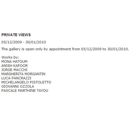 PRIVATE VIEWS 05/12/2009 - 30/01/2010 The gallery is open only by appointment from 05/12/2009 to 30/01/2010. Works by: MONA HATOUM ANISH KAPOOR JORGE MACCHI MARGHERITA MORGANTIN LUCA PANCRAZZI MICHELANGELO PISTOLETTO GIOVANNI OZZOLA PASCALE MARTHINE TAYOU |