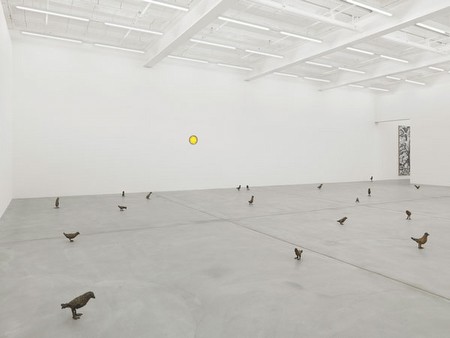 UGO RONDINONE, KISS NOW KILL LATER Galerie Eva Presenhuber is delighted to open the autumn season in their new facilities with a solo exhibition by Swiss artist Ugo Rondinone, who is based in New York. The exhibition is designed in sequences: in each of the exhibition rooms, which are painted grey, three work groups are displayed, and recent works are combined with existing series. Amid these three work groups, one diminutive piece makes a distinctive appearance: a clock made from stained glass with no fingers, which is cast into the wall and is thus illuminated by daylight. In the first room, we have a new body of work on display: a series of bird figures. A total of thirty bird sculptures have been installed across the whole of the exhibition space, as if in a flock. Created in various sizes, they are moulded in various positions and are all facing different directions. For the most part, these delicate sculptures do not exceed five inches in height and their characteristic claws, beaks and tails, though meticulously crafted, still manage to give of an air of casualness. Their appearance is that of birds, but their character is not. The titles of the bird sculptures refer to natural phenomena. In this way, they represent the natural world outside the artistic space. Their presentation within the group conveys the idea that those non-descript birds stand for more important events. The sculpture surface is covered with dense networks of fingerprints, which form stylised reliefs and mean that the work is forged entirely in the artist’s distinctive style, thus breaking the connection to real birds. The artist has borrowed this surface texture from his masks series. Like with these masks, the actual process of modelling the clay is visible since the artist’s fingerprints, created when moulding the clay, remain on the material after casting. In this way, the creation process is caught in time and is preserved in the finished sculpture. This moment is further emphasised by the materiality of these gracefully-formed figures: cast in bronze and installed on the floor, the creatures have been deprived of their most important feature: the ability to fly. This is compounded further through the artist’s choice of bronze as his work material. Its colour, too, is similar to the colour of the clay, something which that the artist considered as important in his choice of materials. The fact that the bronze was left raw and that the birds differ only in their finish, and not in the colouring of their would-be plumage, affirms this impression even more. In the second exhibition room, six ten-foot by thirteen-foot ink paintings are hung on the walls. They feature Arcadian landscapes and forest paintings on large paper that has been stretched on canvas and mounted in a frame. They show drawings that are traditionally made in a sketchbook, with motifs reminiscent of the intimacy of 18th century cabinet pieces. Here, they are reproduced on a large scale, developed using a slide projector to enlarge miniatures. This is meant to allow the spectator to establish a direct physical relationship with them while at the same time empathising with their content. The large format has the effect of opening the spectator’s perspective on untouched landscapes and reflects an unaffected approach to idyl and nativeness. Their size means that they simulate the immediacy of a real experience for the spectator. The appearance of the ink drawings refers to the art form of calligraphy. This is because the artist is, in fact, working with a Chinese brush. The calligraphy symbols represent the movement of the artist’s hands and are comparable to the fingerprints on the bird sculptures. The artist has been creating these monochromatic ink landscapes since the early 1990s. The collection is an as yet unfinished series that Rondinone has diligently worked on since his first solo exhibition, with Eva Presenhuber in Galerie Walcheturm in 1991. However, the most recent exhibition of these landscape drawings was held in 2002 at Sadie Coles HQ, London. There was therefore a strong desire for access to be granted to the public for this important body of work; one which the artist has previously described as the basis of all of his work, including his new drawings from 2011. When asked about his muse, Ugo Rondinone refers significantly to 'Early Morning', a small watercolour painting, measuring 7 x 9 inches and depicting a forest landscape in sepia, created by English artist Samuel Palmer in the year 1825. This is how the artist accounts for his choice: "A work of great spiritual power, it achieves and articulates a unique fusion of language, perception and visions. Its delicate touch plays on the texture richness that we find between the folds of very modest episodes, evoking a frisson of deep recognition, a sense of primal encounter with the brilliant, elusive world of senses. There is a striking freedom of style here, which allows the artist to move without any sense of strain or loss of balance from the visionary and ecstatic to the exquisitely precise. 'Early Morning' is an elegiac meditation on love, loss and the spiritual beauty of nature." (in: domus 942, December 2010, p. 111) The exhibition closes with a group called 'lines out to silence', on display in the third room. These lines are drawn in the form of poems copied out by the artist by hand on old boards of weather-beaten scrap wood. These new pieces also recall existing, similar works already shown at Whitechapel Gallery in 2006. His treatment of poems is another significant feature of Rondinone’s work as a whole. It can be seen in his use of poems in colourful neon sculptures, in pencil drawings sketched directly onto walls, in acrylic paintings made on newspaper and in the poetic titles of all of his pieces. The interaction of his findings -where the choice of material always plays an important role- with the transient perfectly reflects how Ugo Rondinone appro