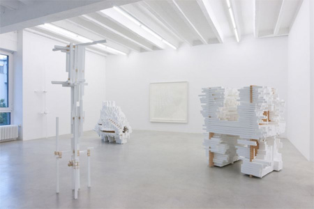 TOBIAS PUTRIH A, H, O, I, ! ... April 30 - June 25, 2011 Galerija Gregor Podnar is pleased to announce the opening of the exhibition A, H, O, I, ! ..., which presents Tobias Putrih�s latest sculptures and works on paper. The work of Tobias Putrih is based on several interconnecting ideas and practices; in particular, he is interested in how architecture, design and science affect systemic societal structures. As in the case of the four sculptures A, H, O, and I, which provide the starting point of this exhibition, the materials Putrih uses often consist of simple, elemental structures. These modular objects, able to be altered, are made of long styrofoam sticks supported by an inner wooden grid structure serving as a kind of connector system. The four letters on display humorously refer to the signal word "Ahoy," a familiar word from the sailor�s vocabulary and also used daily as a form of salutation or greeting in the Czech Republic and Slovakia. These modular objects were created as a tribute to the �Reliefometar� sculptures by Croatian architect and artist Vjenceslav Richter (1917-2002), who, as co-founding member of the Zagreb group Exat 51, promoted a neo-avantgarde utopia fusing art, architecture and design with everyday life. In another references also dating back to the 50s and 60s, Putrih�s new sculptures are related to the ideas of the Metabolists, a group of Japanese architects and city planners (Kiyonori Kikutake, Kisho Kurokawa, et al) founded in 1959. Their vision for the cities of the future to be inhabited by mass society were characterized by flexible, expandable large-scale structures evoking the processes of organic growth. In their view,The Metabolists held the traditional laws of fixed form and function were to be obsolete. They considered the construction of buildings for the community to be understood as a metabolic process, just as communities themselves are in a constant state of biological renewal and thus fall outside all fixed and schematic design principles. Following these modernist ideas on the continuous transformation of architectural and social spaces, the styrofoam pieces are a playful attempt to generate an interconnected system of signs and meaning with the use of modular structures. Putrih�s new collage newspaper works entitled Times (which also contain the date of each issue), to be shown for the first time in the Berlin exhibition, follow the reverse principle. This series consists of old morning newspapers that Tobias Putrih read every day and cut up; they are exhibited as glue-soaked, hardened plates of chopped newspapers. The papers � or the letters and images of the paper medium � are consequently transformed into an unstructured form freed of all �meaning�. The large-format pencil drawings, O to H, End of A, Beginning of O, present a synthesis between the styrofoam and paper works. These works feature stacked, growing, honeycombed structures of letters positioned between modular architectonic constructions and ruin-like aggregations of shapes that appear to be collapsing in on themselves. Based in Cambridge, Massachusetts (USA), Tobias Putrih (born in 1972 in Kranj, Slovenia) has exhibited his work to great acclaim in both Europe and America. In 2002, he took part in Manifesta 4 in Frankfurt am Main; in 2005, he appeared in the show Greater New York at PS1 in New York; and in 2006, his project MUDAM�s Studio (a collaboration with Sancho Silva) was presented at the new Mus�e d�Art Moderne Grand-Duc Jean (MUDAM) in Luxembourg. In 2007, he represented Slovenia at the 52nd Venice Biennial, and an overview of his works was also shown that same year in the Quasi-Random exhibition at the Neuberger Museum of Art in Purchase, New York. In 2010 he took part in the �Promises of the Past� group exhibition at the Centre George Pompidou in Paris and participated in the 29th Biennial of S�o Paulo. In May 2011 he will be showing his next solo project at Meulensteen Gallery in New York. |