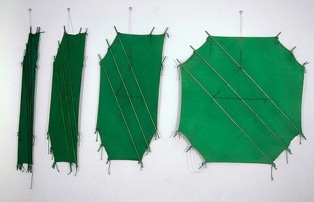 Richard Smith Kite Paintings 22 November 2012 – 12 January 2013 No Evening Private View as previously announced In 1972, Richard Smith exhibited his first 'kite’ paintings at Kasmin Gallery. More kite paintings followed at his show in 1975 at O.K. Harris Gallery in New York. In the same year, Smith was offered a retrospective at the Tate Gallery and he made use of the central Duveen Gallery to display a series of large-scale kite works, both affixed to the wall and suspended from the ceiling, their ropes trailing to the ground. Richard Smith has always been interested in paintings which work in three dimensions, often making use of both floor and wall. Canvases stretched over wooden frames, then painted, appeared in 1963. Gradually his wooden frames diminished in size and the canvases became more wall mounted affairs. Eventually, Smith replaced the heavy wood with thin aluminium poles on which the painted canvas was stretched in shapes ranging from a narrow, vertical rectangle to square. A single work might consist in three or more canvases either overlapping or hanging in sequence. Richard Smith was by then living in the English countryside, having returned from New York, and his colours underwent a shift towards the pastoral and muted. The sequencing of canvases in a singular work, with a single colour rendered in different tones from canvas to canvas, reminds one of Monet's serial paintings, such as his Haystacks series, with a singular subject painted in different chromatic keys. Smith's approach to painting echoes that of the French Support-Surfaces group, who at the time were investigating the possibilities of unstretched canvas, manipulated into different shapes, using both wall and ground as spaces for two-dimensional artworks. The kite paintings are meticulously worked through. The contrast betwen hard poles and soft canvas is carried over to the use of string and rope, the soft means by which the hard stretch is obtained. As Barbara Rose wrote in the Tate Gallery's catalogue to Smith's exhibition, 'The conception of the stretcherless paintings, that are surface alone, has finally coalesced: separable elements are once more thoroughly synthesised in the new format... These consistent allusions to the human condition prove that abstract art is not necessarily divorced from man's experience'. Richard Smith was born in Herfordshire in 1931 and lives in New York state. For further information please contact [email protected] Tel: +44 (0)20 7493 2488 Gallery hours: Mon - Fri 10am - 5.30pm, Sat 11am - 4pm |