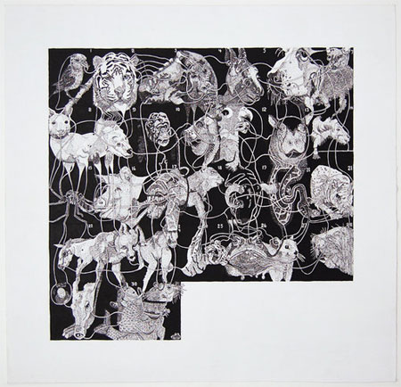 Martin Wilner Making History: UK Private view: Thursday 15 April 6-8pm 16 April - 29 May Hales Gallery is pleased to announce the first solo exhibition by New York based artist Martin Wilner. Making history: UK features twelve pen, ink, and graphite drawings, each representing a month in 2009 and are a continuation of Wilner's ongoing work Making History. Also on view will be recent examples of Wilner's other ongoing project, Journal of Evidence Weekly. Wilner's series Making History uses the convention of the Roman calendar to capture the dimension of time. He deconstructed various elements of newspapers and magazines, selecting images, texts, and maps to create monthly drawings that are the result of a game of cadavre exquis played solitaire. Each total drawing is comprised of all the days of the particular month it was worked on. For Making History: 2009, Wilner decided to utilise British newspapers for the entire year as source material for his appropriationist draftsmanship, primarily The Guardian, but also The Times, The Daily Telegraph, The Independent and even The Sun. Wilner found himself as an artist, increasingly involved in a reverse migratory process akin to the 19th Century social scientist Alexis de Tocqueville in his renowned study Democracy in America. While Wilner remained physically in the United States, he was able to have the virtual experience of life in the United Kingdom through the prism of its online media. He became increasingly fascinated with British journalists' lack of concern to conceal their political bias and to find that in a nation of libel tourism, journalists themselves drift regularly into the scandalous, in often-hilarious fashion. 2009 saw the worst international economic recession since the Great Depression of 1929, and a year of worsening climatic devastation. Making History: May 2009 tells the tale of the collapse of the American auto industry, which in our globalized planet, resulted literally in a massive pile-up. Wilner often turns to the animal kingdom, as he does in Making History: March 2009 to metaphorically narrate our relationship to other species, many endangered largely at our own hands. Making History: April 2009 became a rogue's gallery of mass murderers and mayhem makers and Making History: July 2009 became a kind of revisit to Krafft Ebbing's Psychophathia Sexualis. And as a departure from Wilner's self imposed representational parameters of the year, Making History: September 2009 made use of selections from musical scores to create a kind of soundtrack to the cinematic visuals of the rest of the year, a nocturne composed from the detritus of daily events. Journal of Evidence Weekly stems directly from a feverish dream in which he dreamt that he was about to miss a deadline for a periodical of that same name. As a practicing psychiatrist, Wilner proceeded to self-analyze the dream associatively. His first association was to the acronym of the periodical, which was J-E-W. As a child of Jewish Holocaust survivors, he realised that there was great personal significance to this dreamed reference to responsibility and history. He chose to bring the dream into reality by creating an ongoing series of books of drawings executed entirely while he is in transit, primarily in the subterranean realm of the New York City subway system. The books are mostly in variants of a leporello format, one that structurally conveys the elements of motion over time. Recent volumes have become attempts at capturing the acoustic nature of this world in transit, the snippets of overheard conversation, the plea of the beggar, the muttering of the insane, the announcements of the conductor and the screech of the braking train. This sensuous cacophony is illuminated with strangely fetishistic disembodied elements of figuration, a leg here, a chest there, a grasping hand, and a desperate visage. Martin Wilner was born in 1959 and lives and works in New York City. His recent one person exhibitions include A Life in Days, Sperone Westwater, New York 2010, More Drawings About History and Evidence, Pierogi, Brooklyn, New York 2008, Journal of Evidence Weekly, The Cartin Collection, Ars Libri, Boston, 2008, Artists Book Program, Bravin Lee Programs, New York 2008. Recent museum group exhibitions include Reinventing Ritual, Jewish Museum, New York, 1999, Drawn to Detail, De Cordova Museum 2008, Mr. President, University Art Museum, Albany 2007, Off the Shelf, Frances Lehman Loeb Art Center, Vassar College 2006. His work is included in many important public and private collections including the Los Angeles County Museum of Art, the Jewish Museum, the Vassar Art Library, the Cartin Collection and Warner Bros. |