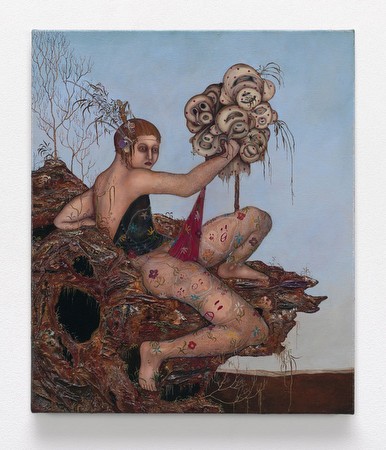 Anj Smith The Flowering of Phantoms 15 January – 23 February 2013, Hauser & Wirth New York, 69th Street New York, NY… The eerie, luminous, compact portraits and landscapes of London-based artist Anj Smith are exercises in extravagant meticulousness. The magic of her laboriously depicted figures and motifs, however, derives in large part from the contrast Smith creates in surrounding areas of loamy, thickly applied impasto. This formal incongruence – between the intricate and the inchoate, between a jewel-like glow and rough scratchings, between filigree and mire – is crucial to Smith’s work. It suggests that she seeks to navigate a murky psychological space far beyond the reach of her virtuosic single-bristle brush. In her world, certainty is just a vestige of the past, with everything today existing in a fragile, constantly shifting instability. Beginning 15 January 2013, Hauser & Wirth New York will present ‘Anj Smith: The Flowering of Phantoms’, an exhibition of new paintings that will remain on view in the gallery’s East 69th Street townhouse through 23 February. The exhibition coincides with the publication of ‘Anj Smith – Paintings’, the first major monograph devoted to the artist’s work. With the title of her exhibition, Anj Smith points to the central theme of her practice. Citing Netherlandish vanitas paintings, she has written, ‘Those artists worked with a visual language comprised of symbols that had very clear, established meanings, codified and knowable. Back then a skull was depicted to remind viewers of their mortality. In our time – and therefore in my work – there is no single concrete narrative. Symbols no longer stand for fixed intentions and a skull can mean pretty much anything, including, at the moment, an iconic motif for a scarf. Even so, I feel those old defunct symbols retain a kind of ‘half-life’ meaning, a vestige of their purpose. As their original content decays in the present, they still suggest something to us, even if that ‘something’ is less clear and is morphing into something else’. In Smith’s paintings, these decaying phantoms of meaning are phenomena in their own right, blossoming literally and figuratively, suggesting multiple new, if bewildering, meanings as they evolve. A thematic corollary to such general elusiveness is the gender ambiguity in many of Smith’s portraits. In ‘The Moon, Like a Flower’, the delicate features of a sitter with long blonde hair might equally be described as feminine or effeminate, and are interrupted by sprouting facial hair that could indicate male pubescence. In ‘The Sentry’, the viewer’s eye sweeps down from a lipsticked mouth and intricate headpiece of feathers and fossils, to a pair of massive masculine thighs and a flower-covered codpiece that protects the mystery of the figure’s identity. Both isolated and on display, these subjects maintain their distance from the viewer but are far from idle: Smith’s subjects deliberately frustrate norms of composure, decorum and self-possession. Half naked and at the same time elaborately attired, their fantastical ensembles simultaneously camouflage and affirm individuality. In the works on view in ‘The Flowering of Phantoms’ – in such formal portraits such as ‘Ziggy’ and ‘High Blue Country’, as well as the wider compositions like ‘New Blooms at The Ossuary’ – organic and inorganic objects alike tend to snake, coil, twine, twist, and weave, teasing the eye with tendrils, creepers, roots, and veins. By collapsing the traditional genres of ‘portrait’ and ‘landscape’, Smith suggests a territory in which neither one is adequate to represent contemporary experience. Time is often fragmented in Smith’s scenes, which appear simultaneously retroactive and futuristic but neither firmly of the past or the present. In ‘Fruits Of The Forest’, fossils seem to decay into base-matter faster than the ‘fruits’ of such fashion sensations as sequined fabric. While the artist is rendering a bleak and inhospitable environment, she suggests possibility: The makeshift structures she depicts may be cobbled together from wire, cigarette butts and twigs, but between them gauzy tangles of exquisite fabric stretch into new configurations. |