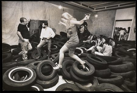 Allan Kaprow with participants in Yard, 1967 at the Pasadena Art Museum