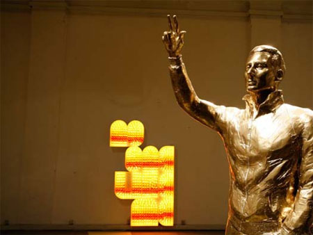 Vuk Vidor Superheroes � Solo Show 28 Nov - 24 Dec 2009 The Magda Danysz gallery presents for the first time Vuk Vidor�s recent works, the second stage of his americain Quartet. A work focused on the modern world, current events and precisely the ultra power of the United States. We find in his works the American comics� drawing style but here the super-heroes are mostly pathetic or discouraged. Famous art critic Jean-Luc Chalumeau describes the work of this French-Serbian artist this way "we do not describe the painting of Vuk Vidor: too varied, too surprising, too mysterious in certain cases. But it is painting". Vuk Vidor is not only a painter, he also works on metal, steel, photography, he creates monumental installations and realizes collages. This multidisciplinary artist exposes in Belgrade, New York or Copenhagen. This painting contrasts with the importance of the ideas. He uses every time a pop colored language in which every detail is an element of the story but the works of Vuk Vidor are deep and serious. The religion is omnipresent and his American super-hero is soon transformed into a crucified Christ having for cross its own country or carried by the Statue of Liberty like a modern Pieta and covered by Stars ans Stripes flag by way of shroud. In this exhibition, Vuk Vidor express himself with large format painting, laser cut sculpture of these American heroes and you will discover a special installation in the project room about the ego of the artist. Vuk Vidor himself represented in a statue made of gold. Vuk Vidor is like that, he combines the spiritual depth and the symbols of comics to demonstrate us - in a particularly colored style - that today "even the super-heroes can�t save us any more". Even before the recession, Vuk Vidor�s heroes had become unable to carry the American dream. |