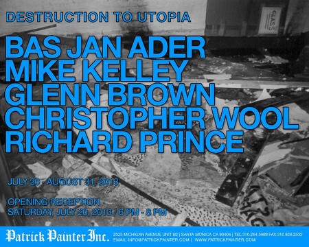Destruction to Utopia: Bas Jan Ader, Mike Kelley, Glenn Brown, Christopher Wool, Richard Prince July 20, 2013- August 31, 2013 Opening Reception: Saturday July 20, 2013, 6-8pm Patrick Painter, Inc, is pleased to announce a group exhibition featuring the works of Bas Jan Ader, Mike Kelley, Glenn Brown, Christopher Wool, and Richard Prince. The exhibition, "Destruction to Utopia," will begin on July 20, 2013 and run through August 31, 2013. Please join us for the opening reception on Saturday July 20, 2013 from 6-8pm. |