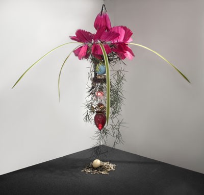 "Where the Wild Things Are"... is no place at all and all places that cannot be lived in but visited, realized out of our careful, playful and tenacious tourism of others, realized as our mobility wanders too far. Rina Banerjee's work explores specific colonial moments that reinvent place and identity as complex diasporic experiences, their aesthetic and cultural beginnings suggest in particular how the many regional culture affects continue to stain our perceptions of home, the exotic, the foreign and domestic worlds. Her system of assemblage' of colonial objects, souveniers and decorative crafts make the experience of seeing artifact and history in art making as an entangled process which reconfigure our boundaries and those trespasses that occur with increased mobility. The global place is garden made out of travel both real and imagined and illusionary world. She began her education/profession as a material science engineer hence the artwork has a sense of material awareness often mixing the organic and plastic to invite a blurring of our recognition. She creates sculptures, installations, videos and drawings inspired by a wide range of mundane objects, home crafts, and her imagery stem from multiple cultural histories both eastern and western art. Rina's characteristically mischievous process of transformation of objects and their cultural locations playfully unhinges them from their unique specificity. The result has been both a fragmented object that offered a new way of seeing the culture. Her use of narrative text which decorate the work with meaning and intention further playing with the idea of artist voice and the aesthetic of exotic beauty physical illusion of ornamental object as sign. Rina Banerjee was born in 1963, Calcutta, India. Educated at Yale University, School of Art 1995 and currently lives and works in New York City. She has exhibited internationally including solo exhibitions in New York City, with upcoming exhibitions Berlin(2007), Paris(2006) . She has shown in such prominent group exhibitions as Tsumari � Echigo's 3rd Triennial , Japan(2006), The Greater New York Show, PS1 MOMA(2005), Massachusetes Museum of Contemporary Art, North Adams (2004), Whitney Museum of American Art's Atliera Space(2003).The Whitney Biennial (2000) at the Whitney Museum of American Art. |