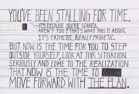 In Gallery 1 DEB SOKOLOW In Gallery 2: THE POWER OF SELECTION, PART 3 curated by Ryan Travis Christian Western Exhibitions is pleased to present a solo exhibition by DEB SOKOLOW in Gallery 1 and a group show in Gallery 2, "The Power of Selection, Part 3", curated by Ryan Travis Christian, that runs from November 19 to December 31, 2010. Both shows opens on Friday, November 19 with a reception, from 5 to 8pm, which is free and open to the public. CHAPTER 3 THE PLAN. You'll fly into Denver International Airport in the early morning hours, taking care to book a window seat. Prior to landing, you'll make an attempt to locate the pyramid-like structure southeast of the long-term parking lot. If it's not visible from the air, you will need to rent a car when you land and drive to the corner of ___ and ___ to take a closer look at the structure that is supposedly being built there by those working for the New World Order. Six hours should be long enough to really get a good look at everything on your list inside the airport and outside within its extensive grounds before you fly back home. (SEE LIST OF ITEMS THAT WILL NEED TO BE EXAMINED CLOSELY.) If the theory about Denver International Airport is true, they will be employing numerous strategies to hide everything from the general public, so staying under the radar is going to be important. Of course, under no circumstance should you alert them to the fact that you, for them, are a problematic individual. In a departure from a studio practice that up until now has focused on large-scale, installation-oriented drawings, Deb Sokolow is switching gears to embark on a new, long-term project of writing dozens of chapters, in no particular order, for a book that will never fully exist. Each chapter is drafted by hand on a single 30 x 22 page of paper, edited, erased, rewritten a number of times, and finally mounted onto a tablet-like panel. Each page, when finished, represents an entire visual record of the process that takes place when writing each chapter. The contents of these chapters include both serious and ridiculous investigations into politics and conspiracy theories as well as thoughts on architecture, wig-wearing, and salami sandwiches. These topics will seem somewhat unrelated, but there are two common existing threads: the implication of an overarching narrative (which will begin to take a clearer shape as additional chapters are written over the next few years) and Sokolow's voice, an unreliable alter-ego protagonist, who authors each chapter and provides (in true meta-fiction fashion) a running commentary, often of a self-critical and premonition-like nature, located between the lines of text and margins of each page. Long-term, Sokolow will continue to write chapters and present them, always out of order, in different combinations, so that when mixed and matched, a different "mood" will form from the juxtaposition of the exhibited chapters. Sokolow's stories are inspired from watching of epic-like television dramas such as Battlestar Galactica and Deadwood, and from a recent immersion into books such as Muriel Spark's The Comforters, Thomas Pynchon's The Crying of Lot 49, Iain Banks The Wasp Factory and Umberto Eco's Foucault's Pendulum, all of which incorporate elements of meta-fiction, the unreliable narrator and paranoia into the story-telling process. The first few chapters from Sokolow's book as well as their visuals and sources (such as footnotes, images, architectural renderings, charts and book-like objects) will be presented in this solo show at Western Exhibitions. This is Deb Sokolow's first show with the gallery and her first solo exhibition at a commercial gallery in Chicago since her show, "Secrets and Lies and More Lies" at 40000 in 2006. Her recent projects include large-scale, site-specific drawings for the Van Abbemuseum in the Netherlands, the Smart Museum at the University of Chicago, the Spertus Museum, the Museum of Contemporary Art in Chicago, INOVA [Institute of Visual Arts] in Milwaukee, a solo show at the Kemper Museum in Kansas City and a comic strip commissioned for Creative Time. Sokolow's work will be included in upcoming group shows at the Scottsdale Museum of Contemporary Art and the Arlington Arts Center and in a solo exhibition at Lawrence University. Sokolow's work is in the permanent collections of the Museum of Contemporary Art, Chicago and the Spertus Museum and has been discussed in Artforum.com, Art in America (online), Artnet, Art Papers, Art on Paper, Artslant, Beautiful Decay, Dagens Nyheter, The Kansas City Star, The Milwaukee Journal Sentinel, The Chicago Tribune, Chicago Sun-Times, Chicago Magazine, New City, Time Out Chicago and Jettison Quarterly. She is a 2010 resident of the Art Omi International Artists Residency and received her MFA from the School of the Art Institute of Chicago in 2004. She lives and works in Chicago. Gallery 2 THE POWER OF SELECTION, PART 3 curated by Ryan Travis Christian Western Exhibitions is thrilled to present the third and final iteration of "The Power of Selection", a densely-packed group organized by gallery artist Ryan Travis Christian, in our Gallery 2, with an opening reception on Friday, November 19 from 5 to 8pm. The show runs through the month of December, though after December 23, the gallery is open by appointment. Regular gallery hours are Wednesday through Saturday, 11am to 6pm. Are you taking Ryan Travis Christian for granted? Do you know what he does for you, yes, you? In addition to making highly charged and acutely rendered drawings, Mr. Christian voraciously sees shows in galleries high and low and scours the internet in search of hot new art. He often presents his findings on his Facebook page as an "artist of the day", publishes interviews with up-and-coming artists on Beautiful/Decay and Fecal Face websites and for you lucky Chicagoans, brings all this hot new art to Western Exhibitions in his three part show "The Power of Selection". In