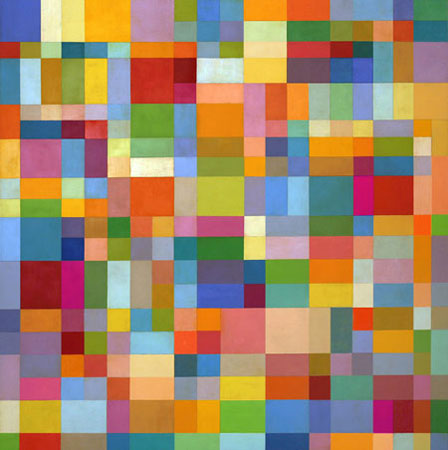 GEORGE MEURANT : NO NEED OF LIGHT 13/06 > 29/07 2008 GEORGE MEURANT : NO NEED OF LIGHTGeorges Meurant's work requires no special lighting. The blues are vivid early in the morning, and late in the evening it's the turn of the reds. At dawn, the three colors on which the works are based settle down. The structures underlying each painting are best showcased at dusk. These works also function under constant lighting: the color rectangles suddenly begin forming temporary groups which we perceive as standing out from the rest, each group soon superseded by the emergence of another, and then another, each of them different. Moreover, some groupings of such rectangles momentarily stand back, forming a ground in respect of which the others come forward; moments later, new groupings assume ground status, and then others. For as long as we look at the paintings, the permutations continue. THE HOW AND THE WHYTo experience these paintings we need no explanations. But we can endeavour to understand the process, and appreciate that the singular spatial tension involved has never been put to such use before. Esthetical theorist Jean Guiraud has suggested metaphorically that the evanescent space engendered by the work, constantly emerging in discontinuous and unpredictable packets, has the features of a quantum structure1 . Meurant's rectangles, placed as by algorithm, illustrate (as do those of Mondrian and Malevich) the search for innovation in artificial intelligence, a field in which engineer Jacques Lef�vre is working2. The poet Bernard No�l has wondered How we name the quality of standing on silence to speak ?3. According to Guiraud, Meurant is at the core of the mechanism that may dictate both the (spatial) coming together of the forms and the (sequential) connections of language, and this may well prove to be the most mysterious � and most important � of his contributions to art.4 A.M Jean GUIRAUD, The Figure Field, looking at Georges Meurant's paintings. Translation from the French by Michael Novy. Brussels : Didier Devillez �diteur, 1994, p 43-49. Jacques LEF�VRE, L'algorithmique �volutive, in: Bernard Yannou and Philippe Deshayes, Intelligence et Innovation en conception de produits et services (part 2), Paris : L'Harmattan, 2006, p 141-186. Bernard NO�L, in a letter to Georges Meurant (7/30/1998). Jean GUIRAUD, [Untitled], Grand Rechain : Keuninckx, 2004. PAS BESOIN DE LUMIERE L'�uvre de Georges Meurant n'exige pas d'�clairage particulier. T�t le matin ses bleus sont exalt�s, tard le soir ce sont les rouges. La trichromie qui la fonde s'�quilibre vers midi. La p�nombre met en valeur les structures qui l'organisent. Cette peinture mute aussi sous �clairage constant : ses couleurs s'associent inopin�ment en configurations qui se d�font bient�t par l'�mergence d'autres groupements, ensuite d'autres. Certains ensembles de formes/couleurs sont per�us comme un fond dont se d�gageraient tous les autres, puis ce sont de nouveaux agr�gats qui assument un moment le statut de fond, puis d'autres encore. Cette combinatoire demeure active tant que dure l'attention. COMMENT ET POURQUOI ? �prouver une telle peinture ne n�cessite aucune explication. On peut cependant comprendre son activit�, d�couvrir que sa tension spatiale singuli�re n'avait jamais �t� accomplie. L'esth�ticien Jean Guiraud sugg�re m�taphoriquement que cet espace �vanescent, qui appara�t constamment par paquets discontinus et impr�visibles, pr�sente les caract�ristiques d'une structure quantique1. Les rectangles plac�s par Meurant de mani�re algorithmique, illustrent (avec ceux de Mondrian et de Malevitch) la recherche d'innovation dans le domaine de l'intelligence artificielle, � laquelle travaille l'ing�nieur Jacques Lef�vre2. Le po�te Bernard No�l s'interroge : Comment nommer la qualit� de ce qui s'appuie sur le silence pour parler ?3. Selon Guiraud, Meurant exploite le c�ur du m�canisme qui pourrait commander et l'agr�gation [spatiale] des formes et les encha�nements [s�quentiels] du langage, ce qui pourrait bien �tre son apport � la fois le plus myst�rieux et le plus important4. A.M Jean GUIRAUD, The Figure Field, looking at Georges Meurant's paintings. Translation from the French by Michael Novy. Brussels : Didier Devillez �diteur, 1994, p 43-49. Jacques LEF�VRE, L'algorithmique �volutive, in: Bernard Yannou and Philippe Deshayes, Intelligence et Innovation en conception de produits et services (part 2), Paris : L'Harmattan, 2006, p 141-186. Bernard NO�L, in a letter to Georges Meurant (7/30/1998). Jean GUIRAUD, [Untitled], Grand Rechain : Keuninckx, 2004. GEEN LICHT NODIG Het werk van Georges Meurant heeft geen speciale belichting nodig. De blauwe kleuren zijn 's ochtends levendig en 's avonds is het de beurt aan de rode kleuren. Bij dageraad, komen de drie kleuren waarop de werken gebaseerd zijn tot rust. De structuren die aan de basis liggen van elk schilderij, komen best tot hun recht in de schemering. Deze werken functioneren echter ook onder constante belichting. De gekleurde rechthoeken beginnen plots tijdelijke groepen te vormen, waarvan we denken dat ze zich van de rest onderscheiden. Elke groep wordt echter al gauw verdrongen door een andere, en dan weer een andere, telkens verschillende. En sommige groepen van rechthoeken trekken zich soms tijdelijk terug, vormen een achtergrond waartegen de andere naar voor kunnen treden. Enkele ogenblikken later, zijn het weer andere groepen die naar de achtergrond treden en dan weer andere. Zolang we naar de schilderijen kijken, duren de permutaties voort. HET HOE EN HET WAAROM Om deze schilderijen te ervaren, hebben we geen uitleg nodig. Maar we kunnen wel proberen om het proces te begrijpen en proberen in te zien dat de specifieke hier opgewekte ruimtelijke spanning nog nooit eerder op een dergelijke manier werd gebruikt. De estheticus Jean Guiraud stelde metaforisch dat 