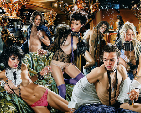 TERRY RODGERS - Radical Continuity From 15 to 27 January 2010, Aeroplastics Contemporary presents a monograph exhibition from American artist Terry Rodgers (b. 1947). Little known in Belgium, the artist already enjoys international renown by grace of his large-format hyperrealistic tableaux, in which he sets the scene with young men and women of a perfect form � at least with respect to the current criteria of fashion and advertising. Half-clothed, adopting lascivious poses in d�cors overloaded with luxuriance, sporting jewels and accessories, champagne glass in hand, these protagonists evoke the decadence of the Empire and the carefree life of a certain gilded youth. But much more than a world sorely lacking points of reference, it is panting itself that the oeuvre of Terry Rodgers examines, and beyond that, our way of representing reality to ourselves. "We live in the amniotic fluid of our little worlds, content in the company of our prejudices." In this one sentence, Terry Rodgers ably sums up the philosophy underlying his work, and the rapport that he wishes to weave with the viewer. At first sight, it is tempting to describe these compositions as evocations of orgiastic after-hours parties, midway between voyeurism and moralising reprobation. But closer examination takes us beyond this too facile reading, to look at the relationships � or rather, the absence of relationships � between the figures portrayed. If they seem at times to touch, they nonetheless appear incapable of establishing any modicum of communication, nor have perhaps the desire to do so. Insulated in their bubble, the actors naturalness may be seen as artificial , underlining the stereotypes that we project upon them. "My paintings describe imaginary worlds created out of offers conveyed by the media � luxury, wealth, as well as a self-validating version of beauty and desire, and all of this shot through with a dose of reality. Just how difficult is it for the participants of such scenes to step out of themselves and connect with each other?" In the end, the veritable subject of these compositions is the individual's aloneness in the crowd, and the way that visual codes proper to painting can re-transcribe this experience. How to translate the contrast between glamour and vulnerability, between a chimerical world and the reality of experience? For Terry Rodgers, photography is of essential value. "I've taken thousands of pictures and I'll take thousands more, to try to discover the expressions and gestures that, I believe, reveal rapports between the internal and external confusion of the world in which we live." These models are for the most part anonymous persons, just crossed on the street, whom the artist invites to come pose in his studio. He then assembles these different scenes in vast compositions, renewing in this way the technique of the Old Masters. As for his choice of using very large canvasses, he evokes the beginnings of Realism, like when Courbet created an uproar by representing an anonymous burial in a format up-to-then reserved for scenes heroic, mythological, or religious. But if the paintings are founded on a meticulous technique, the images attempt, on the contrary, to capture the energy of the moment in just a few brushstrokes. The poses are never chosen accidentally, and reflect what the artist describes as conventions used to characterize individuals and social types. The confrontation between paintings and black-and-white photographs, allows Terry Rodgers to make explicit that which underlies his artistic aims. In these scenes, stereotypified beauty sometimes makes way for the most disturbing ugliness, with individuals masked and deformed. "Certain figures in these images correspond to Western canons of beauty, while others defy it. You can perceive, through these images, that the soul does not reside in the outer physical envelope." Video also plays a central role in the elaboration of paintings, and quotes a media that has become the ultimate synonym for confusion between fiction and reality, ever more so since the invention of reality television. The exhibition also presents illuminated caissons, melding diverse ways of representing the real; like the world that surrounds us, and that we erroneously perceive as a uniform whole, is rather composed of a multitude of fragments. "We tend to forget that everything we see, or hear, is invented. Our experience of life is like a multidimensional game whose pieces are in constant motion." This game with the real, and with the social codes that govern our existence, are at play throughout Terry Rodgers' entire oeuvre. P.-Y. Desaive TERRY RODGERS - Radical Continuity Du 15 janvier au 27 f�vrier 2010, Aeroplastics Contemporary pr�sente une exposition monographique de l'Am�ricain Terry Rodgers (1947). Peu connu en Belgique, l'artiste b�n�ficie d�j� d'une renomm�e internationale, gr�ce � ses tableaux hyperr�alistes de grand format, dans lesquels il met en sc�ne de jeunes hommes et femmes � la plastique parfaite � du moins en regard des crit�res actuels de la mode et de la publicit�. � moiti� d�v�tus, adoptant des poses lascives dans des d�cors surcharg�s et luxueux, arborant bijoux et accessoires, une fl�te de champagne � la main, ses personnages �voquent la d�cadence de l'Empire et l'insouciance d'une certaine jeunesse dor�e. Mais bien davantage qu'un monde en manque de rep�res, c'est la peinture elle-m�me qu'interroge l'oeuvre de Terry Rodgers et, par-del�, notre mani�re de nous repr�senter la r�alit�. "Nous vivons dans le liquide amniotique de nos petits mondes, heureux en compagnie de nos pr�jug�s" : cette phrase de Terry Rodgers r�sume bien la philosophie qui sous-tend son travail, et le rapport qu'il entend tisser avec le spectateur. Au premier regard, il est tentant de d�crire ces compositions comme des �vocations d'after-parties orgiaques, � mi-chemin ent