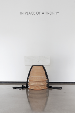 IN PLACE OF A TROPHY Private View: Thursday, 10 April, 2014 Exhibition Dates: 11 April - 31 May, 2014 Vasilis Asimakopoulos | Leo Babsky | Olivier Kosta-Thefaine | Frank Maier 'In Place of a Trophy' presents forward four internationally based artists whose work evades any conventional reading of the object of art. The selected works present a conceptual understanding of the constructed environment; through a re-imagining of context and materiality, the works consider our relationship of space as imagined, evasive, and unstable. Articulated through an unconventional and diverse array of urban materials, such as concrete, brick, wood and metal, the artists approach such unconventional materialization with a surprising, whimsical, and urgent nature, transforming objects that might otherwise be ignored or discarded to create a new temporal language: a landscape of spatial distortion, which (while reminiscent of its initial framework) reinvents itself and appropriates a sense of masquerade. Reused, reshaped and reinterpreted, each artist exhibits a distinct yet related body of work that can be understood archaeologically, as though a future civilization has embalmed and reinterpreted samples from our contemporary urban environment. Here we see captured street scenes, extracts of the metropolis, items of urbanity, artesania, and even kitsch, reinvented with museum-like dissociation, pseudo-scientific analysis, as though a series of cultural, socio-historic curio on display. Here, the viewer is reverted to passivity, refuted entry as though a museum visitor attempting to process the foreign objectivity that has been displayed. Non-descript rubble lying on the side of a pavement is magnified and printed on denim, disguising as painterly tapestry in Vasilis Asimakopoulos’s Knocking. Discarded cement blocks rendered useless at a construction site are encased and presented in a glass cabinet by Olivier Kosta-Thefaine, as objects that should be reconsidered, redefined and treasured. Similarly, the ordinary metal grill of a security fence is moulded and transformed into neat, abstract and geometric patterns in Kosta-Thefaine’s Satrouville and La Gaubretiere and six framed spray painted works hang playfully alongside two forgotten bricks, reminiscent of graffiti sprawled on street corners and walls (Detail D’une Rue and Collection 1). In the same vein, Frank Maier creates asymmetrical sculptural paintings from painted detritus: wood and string. Leo Babsky challenges the material aspects of contemporary life by combining every day objects and allowing the viewer to reconsider their appeal as new constructed and desirable entities: 'In Place of A Trophy' presents objects that are stripped of their original frameworks and uses, inciting us to reconsider our ingrained reference models. Marble, latex and ceramics, precariously stacked and balanced offer distorted mirrors of the every day. Combined, the works provide a new landscape with alternate potential, a glossy caricature of the real that serves to garner a new sensitivity for the static material world that surrounds us. |