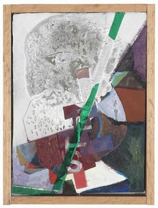 oil, enamel, leather, collage on canvas with artist's frame 18" x 14" |