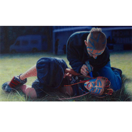 Audrey Nervi Hedonist N.E.E.T. Exposition du 14 novembre 2009 au 5 janvier 2010 du mardi au samedi 11h-19h Vernissage le samedi 14 novembre Chaque d�cennie (ou presque) la jeunesse vient s�opposer � l�ordre �tabli. Cela fait sans doute partie de la construction de la soci�t� et de notre �ducation personnelle : il est un temps pour refuser le monde qui nous est propos�. Et c�est ainsi que nous nous �formons� et devenons, peu � peu, adultes. Normalement ce moment de la vie dure quelques mois et rares ceux qui en font une v�ritable �thique, qui prolongent durablement leur r�ve d�une soci�t� diff�rente. Mais quelques r�sistants se lancent parfois dans une aventure collective en marge des r�gles impos�es. Audrey Nervi documente au cours de ses voyages, depuis une dizaine d�ann�es, les free-parties, raves et autres grands rassemblements qui fonctionnent en dehors de toute culture mercantile, �tatique et officielle. Elle photographie ce monde (dont elle fait elle-m�me partie) puis entre dans son atelier berlinois pour un patient et d�licat travail de peinture. L�image photographique, prise en quelques centi�mes de seconde, devenant lentement une toile qui viendra c�l�brer, pour longtemps, un bref moment de vie commune. La derni�re appellation invent�e afin de qualifier la jeunesse �rebelle� vient du Royaume-Uni et se r�sume dans l�acronyme N.E.E.T. : Not in Education, Employment or Training [ni �tudiant, ni employ�, ni stagiaire]. Audrey Nervi l�utilise comme titre des oeuvres de sa troisi�me exposition dans la Galerie Frank Elbaz. Elle propose ce que l�on pourrait appeler une galerie de portraits (comme on en fabriquait aux si�cles pass�s), nous pr�sentant ses amis et rencontres fortuites lors de ses voyages en Bulgarie, Italie, Allemagne, Roumanie. Des personnes � la recherche du plaisir (ce qui explique la pr�sence du mot �h�doniste� � la suite de N.E.E.T.) et en marge de la soci�t�. Mais, comme le raconte Jean-Luc Godard dans une interview : les marges sont la chose la plus int�ressante dans les livres car c�est l� que l�on peut �crire ses propres mots. En plus des portraits, deux peintures de grand format, compositions �nigmatiques �voquant autant le symbolisme que l�abstraction, viennent compl�ter et amplifier l�aspect politique du travail de l�artiste. Enfin, la peinture d�Audrey Nervi n�est pas le simple transfert de la photographie sur la toile. Elle r�alise, � l�aide de l�ordinateur, des corrections, des collages, des transformations et le lent passage vers la peinture lui permet une certaine �mise � plat� des diff�rents �l�ments. Sa technique est tellement parfaite que l�on voudrait qu�il s�agisse d�un report direct de l�image photographique, oubliant que ce qui fait un v�ritable artiste est sa capacit� � interpr�ter et jouer avec le monde qui nous entoure. Surtout, il n�existe encore aucun moyen technique capable de produire des noirs aussi profonds et d�licats que ceux de ses derni�res toiles. Ses peintures, m�me les plus r�alistes, sont des oeuvres bien plus complexes que leurs images d�origine. Thibaut de Ruyter N�e en 1974 en France, Audrey Nervi vit et travaille � Berlin, Allemagne Audrey Nervi website: www.alligator428.org |