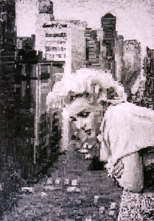 simon holly the typin point Preview: 28th November, 6.30-9pm Open: 29th November � 17th January NB: The gallery is closed between 21st December & 6th January g39 Wyndham Arcade, Mill Lane CARDIFF CF10 1FH A grid system underpins the collage work of Simon Holly. Glossy low-culture posters are deconstructed and meticulously re-assembled, transformed and subverted. Square by square, a poster of a tropical idyll is re-ordered as a symmetrical pattern, a motorcycle becomes a bowl of cherries, Marylin Monroe, an icon of feminine sexuality is reconfigured into Mohammed Ali, the ultimate fighting machine and vice versa. Simon�s work deals with this shift of information. For the show at g39 Simon explores the vast wealth of images available to us through various sources. He tests the �quality�, hierarchy and availability of images, and notions of their similarity, distinction and authenticity. Part of his practice is a negotiation and filtering of imagery in an attempt to find something of value or interest. He is interested in the issue of cloning, the process of sampling, taking a mass of structural information and placing it within a new construction. Working with pixel sized pieces of information he is interested in how they become signifiers only when placed alongside like or unlike information. Every image I work with is translated through the grid system, an analogy to the pixels of digital images. A grid, by its nature, is uniform and non-hieratical. I am drawn towards quite specific types of image. They are often flat and not spatial, blank and everyday and convey their form through standardised colours that we are familiar with. Being free of any complicated cultural baggage, they are more able to transcend their original form when I put them through the translating process. When I look at these images, and the other images I like but never use, I always view them as a very real material. Beginning with me as an image filter, through an objective process that reveal subjective decisions made within it, to the final piece of work that transcends its original state, I want to make art that allows the viewer to break down and look at the image as I once did. Simon is a technology native. Just a generation before him viewed the world as rolling atoms, through dotted halftone or in the random grain of the photograph; Simon sees the world in terms of stacked and ordered pixels, grids translate source material and they are democratic and fixed; no individual square relays more essential information of the image as a whole than any other. His work is about the viewer reading and understanding a mass of ordered information, how the images break down into their constituent parts as you get physically closer and start to understand the order of information. It is only when viewed in its entirety that an image �makes sense� � and that sense is mutable and shifting. Notes for editors: Simon Holly: b.1979, Rhoose, South Wales, Currently lives and works in Manchester. Alongside his practice Simon was an active part of the artscene in Cardiff before re-locating recently. He is also a writer, having contributed to publications by ffotogallery and a regular reviewer for AN magazine. Simon showed with g39 in 2004 as part of �Flim Flam� a group show. g39 is an artist-led organisation based in Cardiff. Established in 1998 it undertakes significant work in supporting emerging visual artists in Wales and acts as a conduit for the introduction of interesting work from further afield. It runs a programme of exhibitions from its permanent city centre gallery alongside projects at temporary offsite venues. g39 works closely with artists, curators, writers and arts organisations; its activities are strategically aimed at creating a network of support and advocacy for artists within Wales while positioning its work firmly in an international context. g39 Wyndham Arcade, Mill Lane CARDIFF CF10 1FH www.g39.org +44(0)29 2025 5541 |