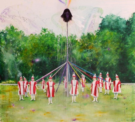Till Gerhard Glaube, Hoffnung und Liebe Although the scenes depicted in Till Gerhard's pictures appear to create an impression of reassuring cosiness, prima facie at least, they elicit a sense of unease when viewed at closer range. Ostensibly harmless prints, based on photographs depicting young people at festivals and atmospheric sunsets, are infused with ominous undertones in terms of their artistic execution via deformed faces, dark, sinister skies and the spectral hovering of mysterious luminous entities. Gerhard ousts these hippy icons from their pedestal of 1960s tranquillity by means of a casual artistic gesture in clear tones, causing them to topple into the here and now via an impalpable shift into the uncanny. Till Gerhard (born 1971) lives and works in Hamburg, where he studied painting until 1998. His works have featured in many exhibitions, including those at the Kunsthalle Hamburg and at the Saatchi Gallery London. After a solo exhibition at the Cologne branch in 2006, the Michael Janssen Gallery now looks forward to hosting Till Gerhard's second solo show in Berlin. Die Szenen in Till Gerhards Bildern m�gen auf den ersten Blick durchaus gem�tlich wirken, sp�testens auf den zweiten l�sen sie Unbehagen aus. Vordergr�ndig harmlose Fotovorlagen von jungen Menschen auf Festivals und vor stimmungsvollen Sonnenunterg�ngen bekommen in der malerischen Umsetzung durch deformierte Gesichter, dunkel dr�uende Himmel und geisterhaft schwebende Leuchtwesen einen bedrohlichen Unterton. Mit lockerem Malgestus in luziden T�nen l�sst Gerhard die Ikonen einer Hippie-Beschaulichkeit von den Sechziger Jahren bis in die Jetztzeit durch kaum merkliche Verschiebungen ins Unheimliche kippen. Till Gerhard (1971) lebt und arbeitet in Hamburg, wo er bis 1998 Malerei studiert hat. Er war unter anderem an Ausstellungen in der Hamburger Kunsthalle und in der Saatchi Gallery London beteiligt. Nach einer Einzelausstellung 2006 in den K�lner R�umen freut sich die Galerie Michael Janssen, nun Till Gerhards zweite Soloshow in Berlin auszurichten. Jin Meyerson progress is no longer a guarantee Jin Meyerson, self-confessed visual junkie and part of an artistic generation which grew up under the influence of mass media, collects the flotsam and jetsam of a daily flow of images and filters it back onto canvas via the cosmos of his private existence. Intricate, distorted motifs of natural catastrophes like the devastating hurricane, 'Katrina', the 9/11 attacks on the World Trade Center and images from the war in Afghanistan trigger nightmarish memories of collective horror and paralysing helplessness with their lurid, CNN aesthetics. Jin Meyerson, born in South Korea in 1972 and raised in the USA, lives and works in New York and Paris. In recent years, his pictures have been exhibited at many international institutes and galleries, including the Chelsea Art Museum NY and the Saatchi Gallery London. Michael Janssen is proud to present Jin Meyerson's first solo exhibition in Germany. Jin Meyerson, bekennender visual Junkie und Teil einer mit Massenmedien aufgewachsenen Generation von K�nstlern, sammelt das Treibgut der t�glichen Bilderflut und schickt es, durch den Kosmos seiner privaten Existenz gefiltert zur�ck auf die Leinwand. Die perspektivisch verzerrten und verschlungenen Motive von Naturkatastrophen wie dem verheerenden Sturm �Katrina�, den Angriffen auf das World Trade Center oder aus dem Afghanistankrieg wecken in ihrer grellen CNN-�sthetik beklemmende Erinnerungen an kollektives Entsetzen und l�hmende Hilflosigkeit. Jin Meyerson, 1972 in S�dkorea geboren und in den USA aufgewachsen, lebt und arbeitet in New York und Paris. Seine Bilder sind in den letzten Jahren in internationalen Institutionen und Galerien, darunter dem Chelsea Art Museum NY und der Saatchi Gallery London, gezeigt worden. Michael Janssen freut sich, Jin Meyersons erste Einzelausstellung in Deutschland zu pr�sentieren. |