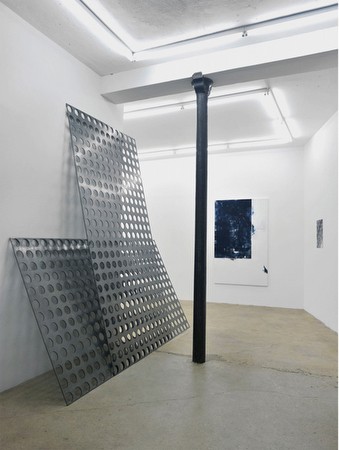 SHILA KHATAMI, it's parallel lines that will never meet 22.02.2012 - 07.04.2012 A note on the work of Shila Khatami The title of this exhibition is a truism. It states the obvious, to a point that makes it sound absurd. Never meeting is part of the definition of parallels. But Shila Khatami is not interested in quoting Euclid, the great Greek mathematician, but in the eponymous lyrics printed on the inner sleeve of the 1979 Blondie hit album Parallel Lines. Ironically there is no song with these lyrics on the record - it never existed. So one could start looking at Shila Khatami‘s work with an idea of loss, searching for something that has gone missing. And it can be found in the inconsistency of her preferred means of support for her paintings: perforated high density fiber boards, commonly used as peg boards for the presentation of items, or formerly used as phonic isolation in sound studios. But this is not about turning a mass-produced industrial material into a fetish. Unlike canvases on stretchers these boards never deliver a coherent white plain to begin with. Depending on the size of the individual holes, the light and the distance to the painting, the viewer can see the white wall shining through. To put it in different terms: the world surrounding them seeps into the paintings, maybe not as much physically as symbolically. The holes also present another challenge; they not only deconstruct the coherence of the physical surface. Arranged to a grid they introduce a rigid organizational basic layer to the composition, as if to contain, contend and control any notion of fluidity of the paint in advance. But Shila Khatami is a virtuoso. She can‘t be contained. Over the last years she has intuitively and emphatically developed a wide-ranging and eclectic arsenal of painterly means, that seeks inspiration not only from classic modernist painters but also in the observation of the design of everyday life and the aesthetics of punk or street graffitis. She has incorporated these seemingly antagonistic painterly idioms into her own language. It ranges from dramatic gestural paint marks in clouds of thinned paint that defy the grid, to straight lines, drawn with ruler and marker pen, as if from half-remembered geometry lessons, following the dots, like in children‘s books. But the artist never resorts to retro-chic, ironic appropriation nor to outright homage. Playing against the grid of the boards she sheds the mythical weight and heroism of her tools, that allows her to construct these images of surprising economy, compositions of tension and beauty, of organization and power, with elegance and wit. Even her large scale sculptural or interventionist work displays her playfulness and humor, taking cues from characteristics of the exhibition spaces as much as from material properties. As when she stacks large sheets of perforated steel against each other, propping them menacingly between a wall and a column, they produce allusions to the sculptures of Richard Serra, as well as they undermine them by means of placement, perforation and subsequent Moiré patterns. In her paintings lines start in one corner, follow the grid, yet somehow seem to end in the „wrong“ place. Executed swiftly, with the ease of a seasoned performer, and often in moderate size, her work is never far from a painterly sketch, obtaining a sense of lightness and simplicity, that may be deceiving. Because the central aspect of Shila Khatami‘s artistic enterprise is to expand a notion of painting as a contemporary strategy to make sense of this world, without adhering to naive mimetic approximations or formulaic simplifications. Her work is a highly poetic undertaking, where there is no final order, no real, nor right or wrong. If at all, this is for the viewer to discern. Bearing in mind, however, that the artist may be operating on parallel lines. - Andreas Schlaegel |