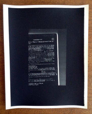 EVE K. TREMBLAY EKTBF451/EKTFF451: NOTES AND CONFESSIONS 05.12. - 23.12.2014 Eve K. Tremblay’s multimedia project Becoming Fahrenheit 451 started in 2007. Similar to many of her other works, it was triggered by an accidental event from the artist’s former nomadic life and sharp observations of her close surroundings; in this particular case, the encounter with a video-rental store in Berlin, in the neighborhood Tremblay was living at the time. The store’s name, Filmgalerie 451, was indeed symbolic; it referred to the name of a famous Sci-Fi novel by Ray Bradbury (in the 1960s loosely adapted into film by François Truffaut) that describes not that distant future in which books and reading are treated as a threat to society’s peacefulness; as a disturbance that supposedly leads to uneasiness, doubt, criticality and consequently misfortune. Therefore, the books needed to be destroyed by specialized squads of firemen; only small groups of dissidents, the so- called “Book People,” had the mission to preserve the books from obsolescence in immaterial form- in their minds, through the specially developed photographic memorization method- in spite of being prosecuted. The event of running across this store in Berlin generated remembrance of Bradbury’s book that Tremblay indeed read a long time ago. This became a starting point for several years of the artist’s immersion into contemplative, playful as much as persistent quest of memorizing Fahrenheit 451, in a metaphorical attempt of “becoming a book.” It engaged the artist’s interests in literature, theater, philosophy and visual arts as much as scientific texts, neuroscience, history of mnemonic systems and mechanisms of remembering and forgetting. Here, poetical approach and philosophical contemplation come into play with constant material experimentations; the still evolving project comprises of numerous media such as performance, video, drawing, collage, sculpture, installation, text, ceramics as well as Tremblay’s most common medium of photography. For MK Gallery, Tremblay envisioned an all-encompassing presentation of her Becoming Fahrenheit 451, titled EKTBF451/EKTFF45 : Notes and Confessions. The exhibition starts with a letter, written and rewritten many times, to the writer Ray Bradbury himself. The letter is an invite for Bradbury to her exhibition, but also reveals, in almost diaristic form, the artist’s thoughts on the whole process of developing this project (as much as her reflections on art making in general) which she defines as “making and comprehending with grey matter” – both by her and by the public. The notes to Bradbury, as much as to herself, are also scattered throughout the exhibition in the form of post-it notes, creating peculiar and engaging juxtapositions of these short texts and imagery that surrounds them. These constellations feature Tremblay’s black and white and colored photographs and videos that had captured numerous days and months of memorizing the book (quite contrary to the fictional fast memorizing method of the “Book People” in Fahrenheit 451) and observing what was simultaneously happening in the artist’s mind, in private interiors of Tremblay’s ever changing apartment(s), but also in various locations during her travels. The images of numerous locales resonate the very process the artist chose for memorization of different parts of the book- by associating them with different locations and architectures from her past (the “memory palaces”.) One particular group of videos and photographs records the people from Tremblay’s surroundings; acquaintances, friends, and colleagues were asked to read and memorize parts of their own favorite books, in almost dreamlike compositions (some echoing the last scene of François Truffaut's adaptation to film of Fahrenheit 451). The artist’s camera captured those people while being immersed in reading, or performing different, sometimes even odd things with their favorite books. The photographs- interiors or scenic natural historical and industrial landscapes (some of them more directly suggesting particular episodes from Bradbury’s book)- not only depict the individuals in action; in them, the books- a recurring motif in all of the compositions- become characters themselves as being brought to life by some supernatural force. There are also some drawings in the exhibition, including Judo drawings (made after the portraits of Yves Klein - known for his deep involvement with Judo training - found on internet) that humorously adduce ongoing struggle with memory slippages (or maybe struggle with the years long project that cannot that easily be erased from the artist’s mind, in order to renew itself and develop new stores and focuses) as well as the compositions of empty memory cards (metaphors for forgetting), made through the physical act of destroying and erasing- traces of colorful and vivid memory cards which served in the process of remembering Fahrenheit 451, with images of backyards (again, particular loci) Eve was walking by on a daily basis while living in Bushwick quarter of Brooklyn, NY. In the exhibition, the memory cards are also presented, as well as the copy of Fahrenheit 451- the artist’s companion since 2007 (purchased by the artist in Mauer Park Floh Markt in Berlin as the already used book) with numerous lines, notes and marks made in different colors by the artist (to facilitate the memorization). These layers upon layers of time and gestures are magnified and underscored in photographic close ups of the book’s used pages, onto which the artists furthermore added remarks and scripts in the gallery space. Throughout the gallery, one can also find staged assemblies Tremblay’s “clay plays”- ceramic pieces with collages, drawings and video stills/photographs printed on them. Ceramics has indeed been fascinating material for this artist in most recent times, because of the specific properties