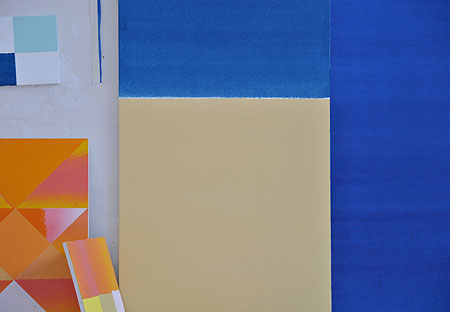 Bodil Nielsen: THE SUN SHNES ON BLUE SKIES Danish artist Bodil Nielsen opens her solo exhibition THE SUN SHINES ON BLUE SKIES at Galleri Tom Christoffersen. The new paintings present deeply rooted ornamentation and scaling with bright colours. The particular use of colours and the various sizes and formats of the canvases activate the space of the viewer. Association relates the many paintings in a way, which is seldom seen in Bodil Nielsen�s previous production. The seriality is played down and the paintings are not organized in systematic pseudo categories. Instead they differ in scale, space, transparency, opacity, format, composition, colour scheme and technique � a multifaceted body of works that gathers as different strands of the same position in the careful installation by Bodil Nielsen. THE SUN SHINES ON BLUE SKIES enhances the possibilities to let the attention move along all possible relations between the works, which results in an ever changing overview. Bodil Nielsen works in the open field between the formal, the ornament, nature observation and the optical effects of colours. In the new paintings an underlying grid of interlocking polygons is scaled up and down from painting to painting as it fluctuates between being a visible drawn line and a hidden structure in the materiality of the paint. The grid can be put into play with the early modernism�s emancipative use of this non-hierarchical and never-ending structure but it is also relevant in play with the decorative intensity of the ornament, which is repeated in almost all visual cultures � an intensity, which in the paintings by Bodil Nielsen creates tensions between the plane and illusory space. The American art movement �Pattern & Decoration� is an important reference in the production of Bodil Nielsen. In the 1970ties �P&D;� looks towards pictures made by non-western cultures and towards the arts and crafts produced by American minority settlements. For example the patterns of systematic geometry referring to the landscape and repeated through generations in the continuous making of quilted and woven fabrics. Patterns that today functions as common point of reference reproduced over time rather than a momentarily statement from an individual voice. Bodil Nielsen�s abstract painting carries the same ideal of being deeply rooted: Partly in the common and collective, partly in the basic observations of nature, distances in the landscape, a seaview � sunshine and shadow. Cube: Hanne Nielsen & Birgit Jonsen Steen: Cameraderies (film, 2007-09) Bodil Nielsen studied at the Royal Danish Academy of Arts, Copenhagen (DK) and the Jan van Eyck Akademie, Maastricht (NL), Holland. She is currently participating in the exhibition �Sense and Sensibillity� med Malene Landgreen, Galerie M�llerWitt, Aarhus (2010). Selected previus ehibitions are: Sunchine & Shadow (Sollo), Galleri Rostrum, Malm� (S, 2010), Against the Wall, Kunsthal Charlottenborg, Cph. (2009/10), OVERGADEN (solo). Overgaden, Cph. (2003). Fact & Value. Kunsthal Charlottenborg, Cph.(2000). Bodil Nielsen has conducted several large-scale commissins and is represented in many public collections. |