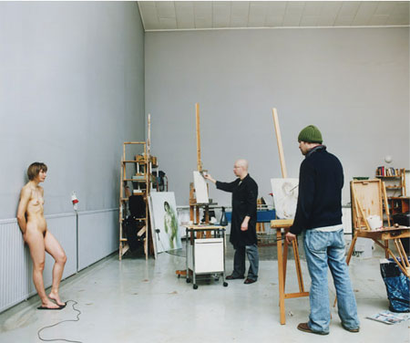 English below Elina Brotherus "Artists at Work" 20 f�vrier - 20 mars 2010 Second volet de deux expositions personnelles cons�cutives d�di�es au travail de l�artiste finlandaise Elina Brotherus � gb agency, cette exposition pr�sente sa derni�re s�rie d�oeuvres intitul�e Artists at Work. Cette nouvelle s�rie r�unit un ensemble de neuf photographies ainsi qu�une vid�o autour du th�me du travail artistique et de sa repr�sentation. Dans la lign�e de ses questionnements sur les rapports entre peinture et photographie mais �galement sur la repr�sentation de l�artiste et de sa relation au mod�le, cette s�rie montre l�artiste posant nue dans un atelier vide devant deux peintres form�s � la tradition classique du portrait � l�acad�mie russe de Saint-Petersbourg. Laissant le dispositif photographique visible � l�image, l�artiste devient ainsi � la fois un mod�le pour les deux peintres mais aussi le mod�le de sa propre photographie. Ce qu�elle per�oit est ainsi mis en ab�me avec la fa�on dont elle est per�ue � travers un chass�-crois� de regards. Les diff�rentes photographies ainsi que la vid�o d�voilent l��volution de la s�ance de pose � travers l�avancement du portrait sur les toiles et les relations de travail des artistes entre eux. Du portrait de l�artiste sur les toiles au portrait photographique des artistes au travail, cette nouvelle s�rie d�Elina Brotherus d�peint un moment de partage et de cr�ation artistique oscillant entre mise en sc�ne et authenticit�. Elina Brotherus (1972) pratique la photographie et la vid�o. Dipl�m�e de l'Universit� d'Art et de Design d'Helsinki, elle vit en Finlande et en France. Elle a re�u le Prix Ni�pce de la Photographie de Gens d�image en 2005 et le Prix Mosa�que du Centre National de l'Audiovisuel du Luxembourg en 2001 et publi� trois monographies: �Decisive days, photographies 1997-2001� (Kustannus Pohjoinen, Finlande, 2002), �The New Painting� (Next Level, U.K., 2005) et �Etudes d�apr�s mod�le, danseurs� (Editions Textuel, avec l�aide de l�Op�ra de Paris, France, 2007). Son nouveau livre autour de la s�rie �Artist and her Model� est en cours d��laboration. Elina Brotherus "Artists at Work" February 20 - March 20, 2010 This second part of two consecutive solo exhibitions dedicated to the work of the Finnish artist Elina Brotherus at gb agency presents the latest series of work by the artist entitled �Artists at Work�. It gathers together a series of nine photographs as well as a video around the theme of the artistic work and its representation. Following a long-time interest in the representation of the artist and her/his relationships to a model, this new series depicts the artist herself being a model of two painters who eventually become models as well. � Who is watching whom? Who is the artist, who is the model? Who gets the �last gaze�? Having used myself as a model since a long time, I wanted to develop further the notions of the artist�s gaze, the model and the self-portrait of an artist. Last summer I met two young painters, Jan Neva and Teemu Korpela. They have studied at the Academy of Fine Arts of St. Petersburg, where the academic tradition of painting the nude still prevails. In art history one can find a type of image where the painter presents himself with the model in the studio (and often looks over his shoulder towards the spectator). I wanted a situation where it is the model who presents herself posing as a model. Traditionally the painter watches the model and the model watches nobody. In our �unholy model session� the roles get mixed: the model becomes an image-maker and the painters become models. In principle the situation is similar to that where I�m making a solitary self-portrait, facing the camera on a tripod, and showing with the cable release that I�m at the same time author and subject, artist and model. However, the painters at work concretisize the posing as even more real. Furthermore, I was curious to hear how it would affect the painters� work when the model looks back at them, observs the observers, makes in turn their portrait with her own medium.� Elina Brotherus, December 28, 2009 Elina Brotherus (1972) works with photography and video. She lives in Finland and France. She was a recipient of the Prix Ni�pce de la Photographie des Gens d�image in 2005 and of the Prix Mosa�que du Centre National de l'Audiovisuel du Luxembourg in 2001. She published three monographic books: �Decisive days , photographies 1997-2001� (Kustannus Pohjoinen, Finland 2002), �The New Painting� (Next Level, U.K., 2005) and �Etudes d�apr�s mod�le, danseurs� (Textuel editions, with the support of the Op�ra de Paris, France, 2007). Her new book on the �Artist and her Model� series is currently under process. |