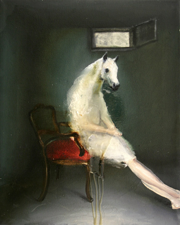 ANDREA LEHMANN Saturday, September 4th, 2010 to Saturday, October 9th, 2010 Aschenbach & Hofland Galleries proudly presents the first solo exhibition of Andrea Lehmann (1975, D�sseldorf) in the Netherlands. The exhibition consists of an installation that takes up the entire gallery constructed out of pieces of d�cor made of paper and cardboard, the most important parts being original paintings and works on paper. It is the third installation in a series titled "Greeneland". Lehman creates installations of paintings, in which she combines eclectic content with painting virtuosity. The visual world Lehmann presents to us is a chaotic jumble of objects, spaces, people and actions with the dynamics of action comics. Greeneland is a direct reference to author, journalist and British secret agent Graham Greene. Just like Greene, Lehmann creates mysterious twilight worlds that make up the setting for research, dreams and miracles. In this third Greeneland, the Geburtstagm�nnchen appear, figures that are half horse, half man. It is these birthday men that make certain images possible, such as a group portrait that can be seen in a large painting of people who have died in childbirth. In the painting the post-mortem pictures of the persons portrayed are painted, just like two Geburtstagm�nnchen. The birthday men are sometimes small, sometimes big, or have long, sharp birthday hats that make them look like unicorns. They are the instigators of many wondrous events. Andrea Lehmann completed her MA studies at the Art Academy of D�sseldorf under Professor Markus L�pertz. Lehmann�s selected exhibitions include The Saatchi Gallery in London, Kunstmuseum M�lheim an der Ruhr, Rubell Family Collection in Miami , Museum Ratingen, Kunstmuseum D�sseldorf and Museum of Glass in Tacoma/Washington. Aschenbach & Hofland Galleries presenteert met trots de eerste solotentoonstelling van Andrea Lehmann (1975 D�sseldorf) in Nederland. De tentoonstelling bestaat uit een installatie die de hele galerie in beslag neemt en is opgebouwd uit decorstukken van papier en karton waarvan de belangrijkste gedeelten originele schilderijen en werken op papier zijn. Het is de derde installatie in een reeks getiteld; Greeneland. Lehmann cre�ert installaties van schilderijen. Hierin combineert ze een eclectische inhoud met een schilderkunstige virtuositeit. De visuele wereld die Lehmann ons presenteert is een chaotische wirwar van voorwerpen, ruimtes, personen en handelingen met de dynamiek van actiestripverhalen. Greeneland is een directe verwijzing naar de schrijver, journalist en brits geheimagent Graham Greene. Net als Greene schept Lehmann mysterieuze, schemerwerelden die het decor zijn voor onderzoek, dromen en wonderen. In deze derde Greeneland verschijnen de Geburtstagm�nnchen, figuren die half paard half mens zijn. Het zijn deze verjaardagsmannetjes die bepaalde beelden mogelijk maken. Zoals op een groot schilderij een groepsportret te zien is van personen die in hun kraambed zijn overleden. Op het schilderij zijn de post mortem foto�s van de geportretteerden geschilderd evenals twee Geburtstagm�nnchen. De verjaardagsmannetjes zijn klein en dan weer groot, of hebben lange scherpe verjaarsmutsen waardoor ze lijken op eenhoorns. Ze zijn de aanstichters van vele wonderlijke gebeurtenissen. Andrea Lehmann studeerde aan de kunstacademie te D�sseldorf bij professor Markus L�pertz. Ze exposeerde onder andere in The Saatchy Gallery in Londen, Kunstmuseum M�lheim an der Ruhr, Rubell Family Collection in Miami, Museum Ratingen, Kunstmuseum D�sseldorf and Museum of Glass in Tacoma/Washington. De galerie is geopend van woensdag tot en met zaterdag van 13.00 � 17.00 uur |