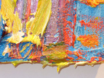 In my workspace, I cover the walls with the images I document, colored papers I have collected with different patterns and textures to bright toys filling my workspace. There is so much influence in my space the eye can hardly rest; it is intense energy and colorful happiness. I work on a series at a time, as many as fifteen paintings. Some times laying down the background, other times scrapping away and covering it up. Each time adding more texture through the thick layers of paint. Over the course of months, my abstract paintings are razed and built-up. My canvases are opaque and full of color, texture and a sensory overload. Steeped in the tradition of oil painting, my paintings are best seen in multiples to get a sense of the sensory overload and rapid eye movement on a subject with the subtle changes.
