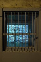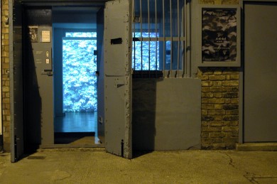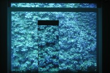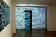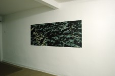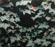 Three pieces as well as re/creating a living environment, form a subtle enquiry into the modes of its representation. The video draws the viewer through it elaborately articulated proscenium to move within the space the leaves and darting birds define. Another mass of ivy leaves printed on industrial billboard vinyl, pressed flat against a side wall, emphasises the reality of the wall itself; while more iconically, floating prod of the wall opposite , an image of a dark hole within those same leaves suggests yet inevitably denies that illusion of penetration.