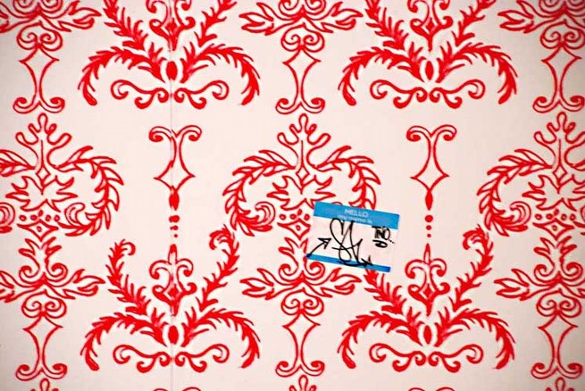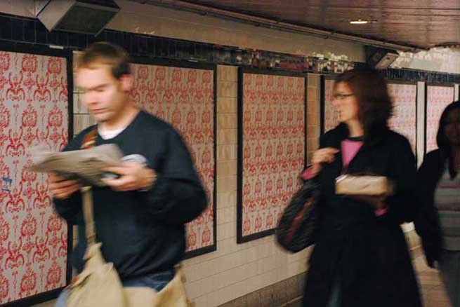 The image designed for this installation is a Baroque floral pattern. The poster is purely graphic. There is no message. The pattern is not just random decoration, but a traditional wall motif, certainly more appropriate to a wall than the advertising it replaces. The original artwork is a small scale drawing, which keeps its sketchiness when enlarged. The walls of the subway station play the role of a drawing substrate, and this project, in effect, becomes an act of drawing on the fabric of the city itself, though using means in stark contrast to the graffiti form of earlier interventions. These posters are paid for as any other advertising, and reflect our current economic and political culture in which free speech is really paid speech.