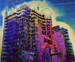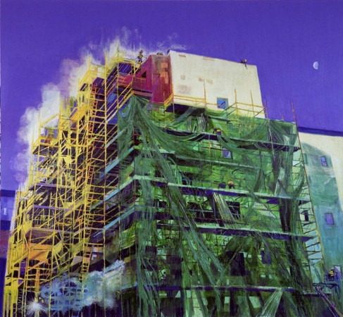 mist--he calls further attention to his manner of handling of paint, and also to his skills of composition, draftsmanship, and attentive imagination. The architectural sites are ambitious industry. Small, hard-hatted figures scurry across vast, rough-edged grids of tarp-shrouded rebar, moving the story by indicating restoration rather than destruction or abandonment, and establishing the grand scale of the undertakingsIn Building Babel (all works oil on canvas, 2011-12) an immense green tarp drapes across the central third of the image. The other two-thirds are divided between bright yellow armature and blazing deep blue sky. The colors in other works are even more intense and artificial--toxic fuchsia, teal, and improbable hues of cherry, lavender and violet. A knack for small detail keeps the eye moving and the surface elaborate. A pair of tiny orange traffic cones in Debris Netting; the diffuse splash of background light in Restoration; the man on a ladder throwing off sparks and rising smoke in Restoration Dust. The greenhouses are overrun with dark ferns and flowering vines, jungle-thick and basted in a wet light and glass-filtered mist. As with the trellis of tendrils linking the sky and ground in Glass House, the way in which McWilliams renders the organic contains its own